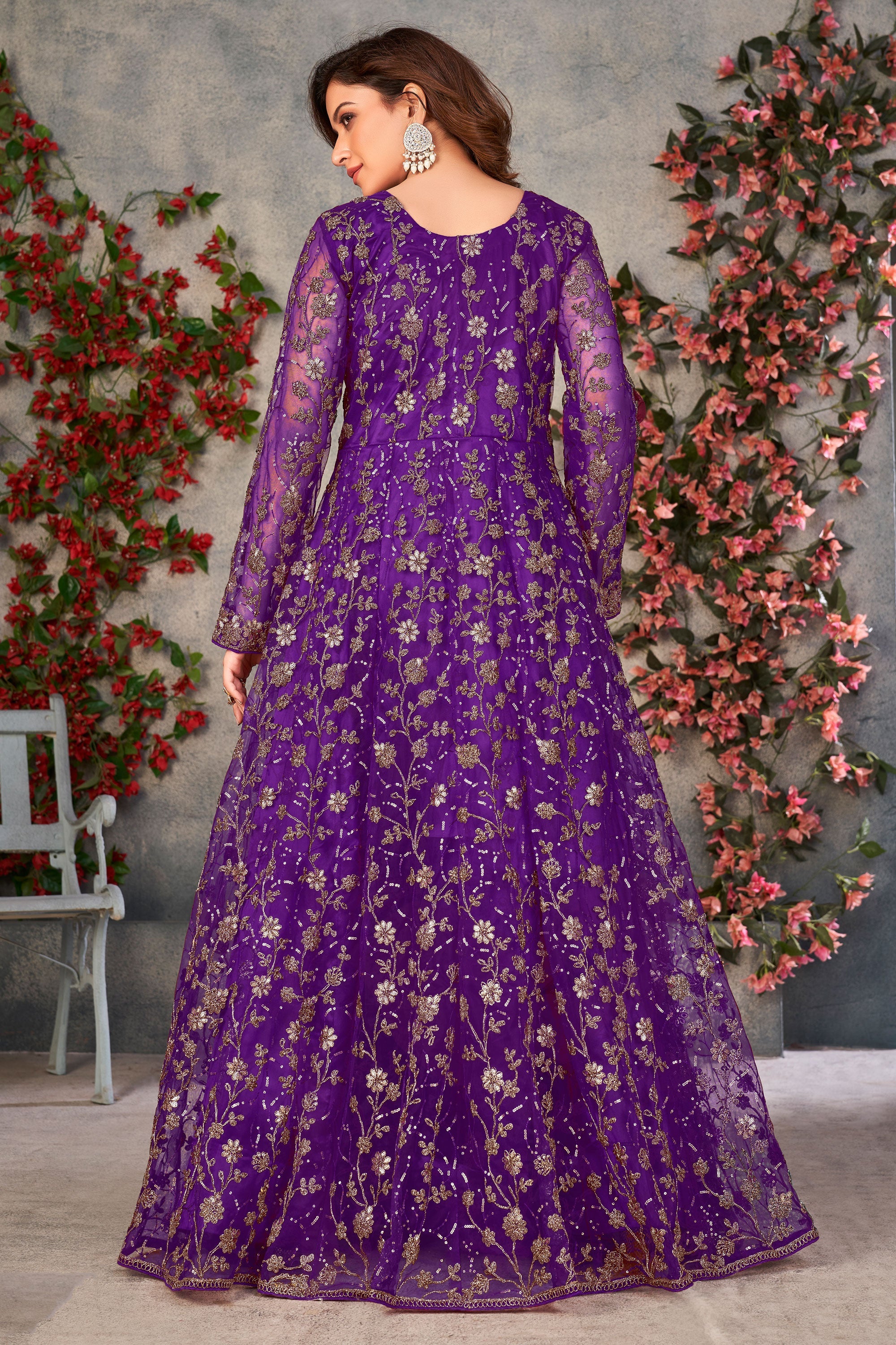 Embroidered Purple Long Anarkali Salwar Suit In Net Fabric