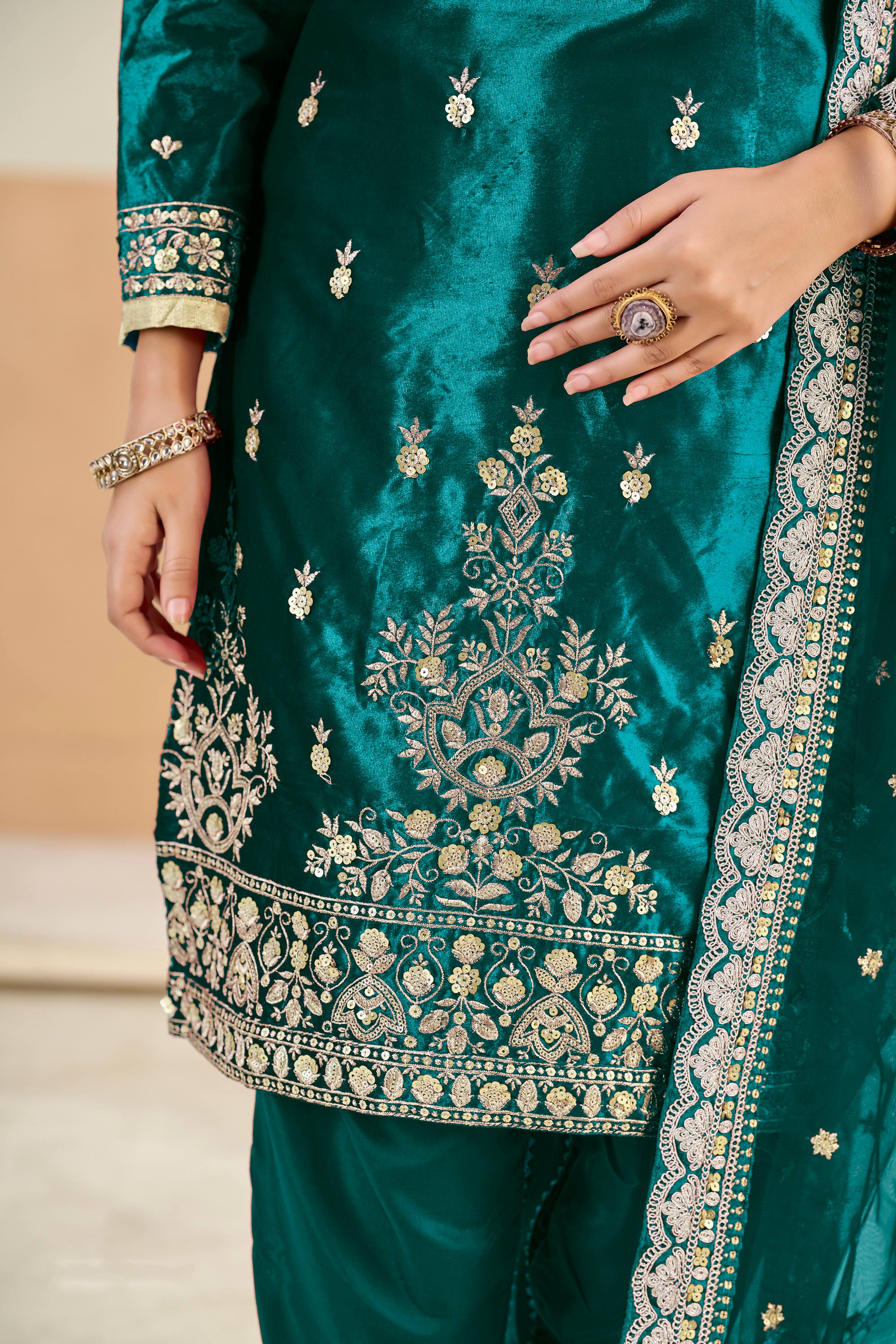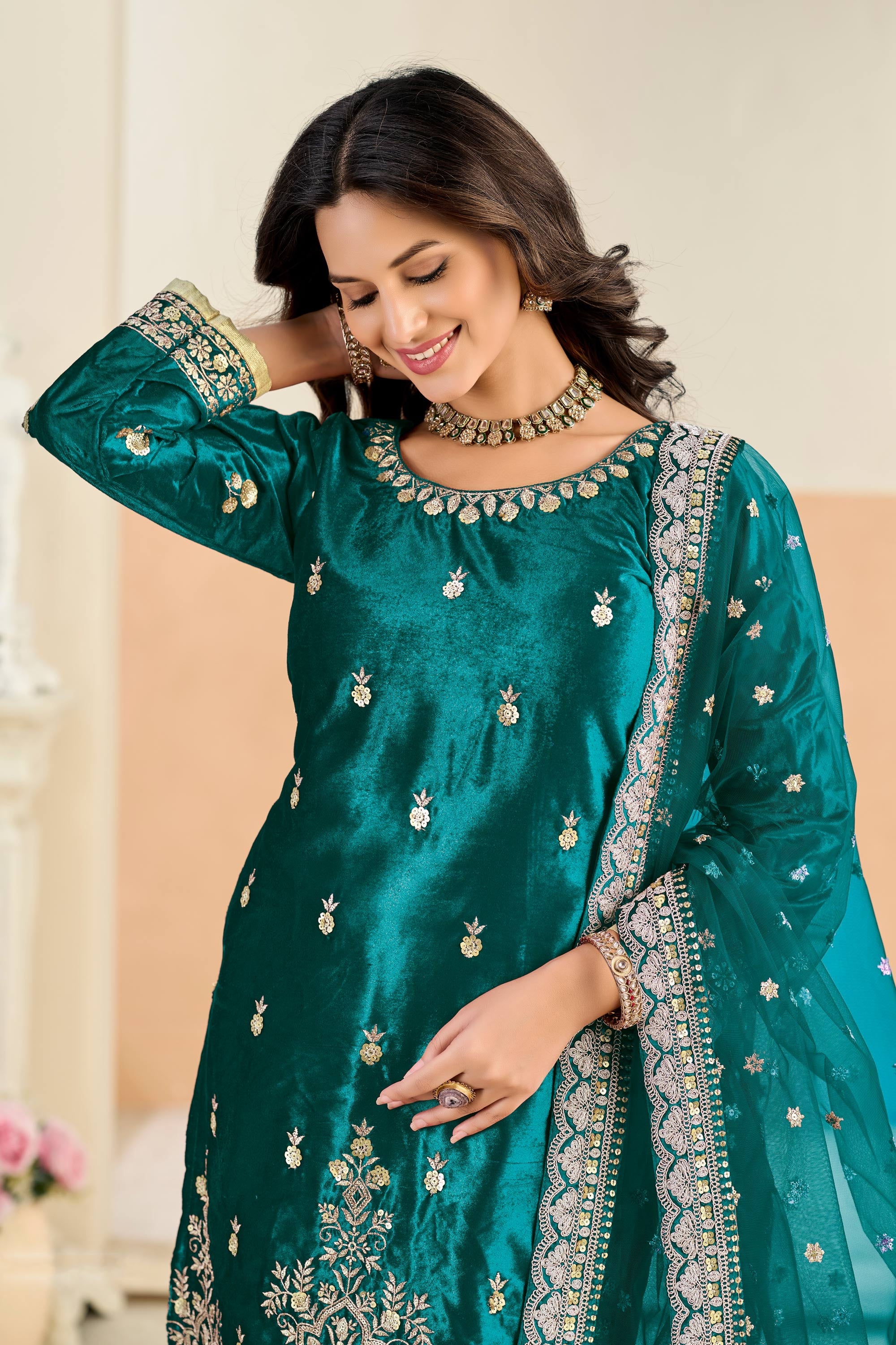 Embroidered Velvet Teal Designer Straight Cut Salwar Kameez For Function Wear