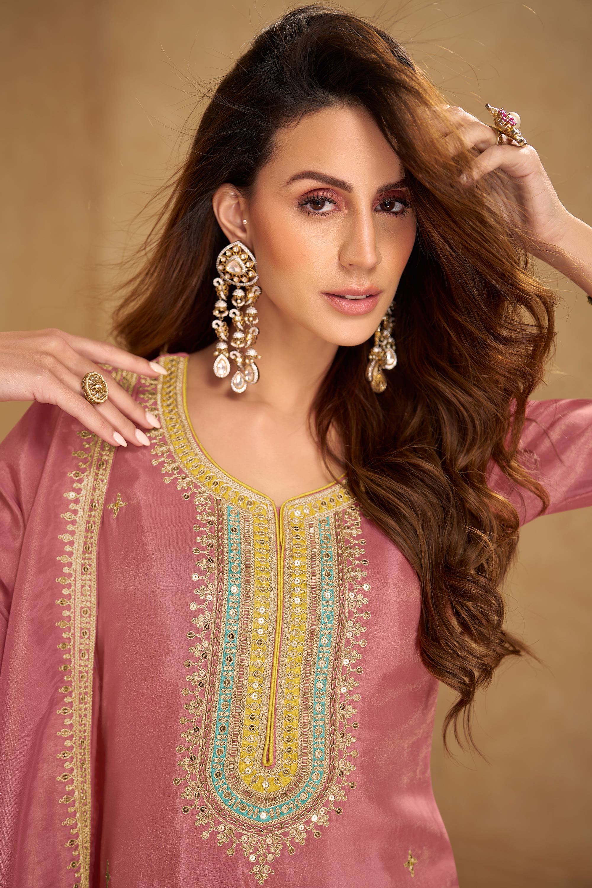 Function Wear Embroidered Readymade Designer Salwar Kameez In Art Silk Pink Color