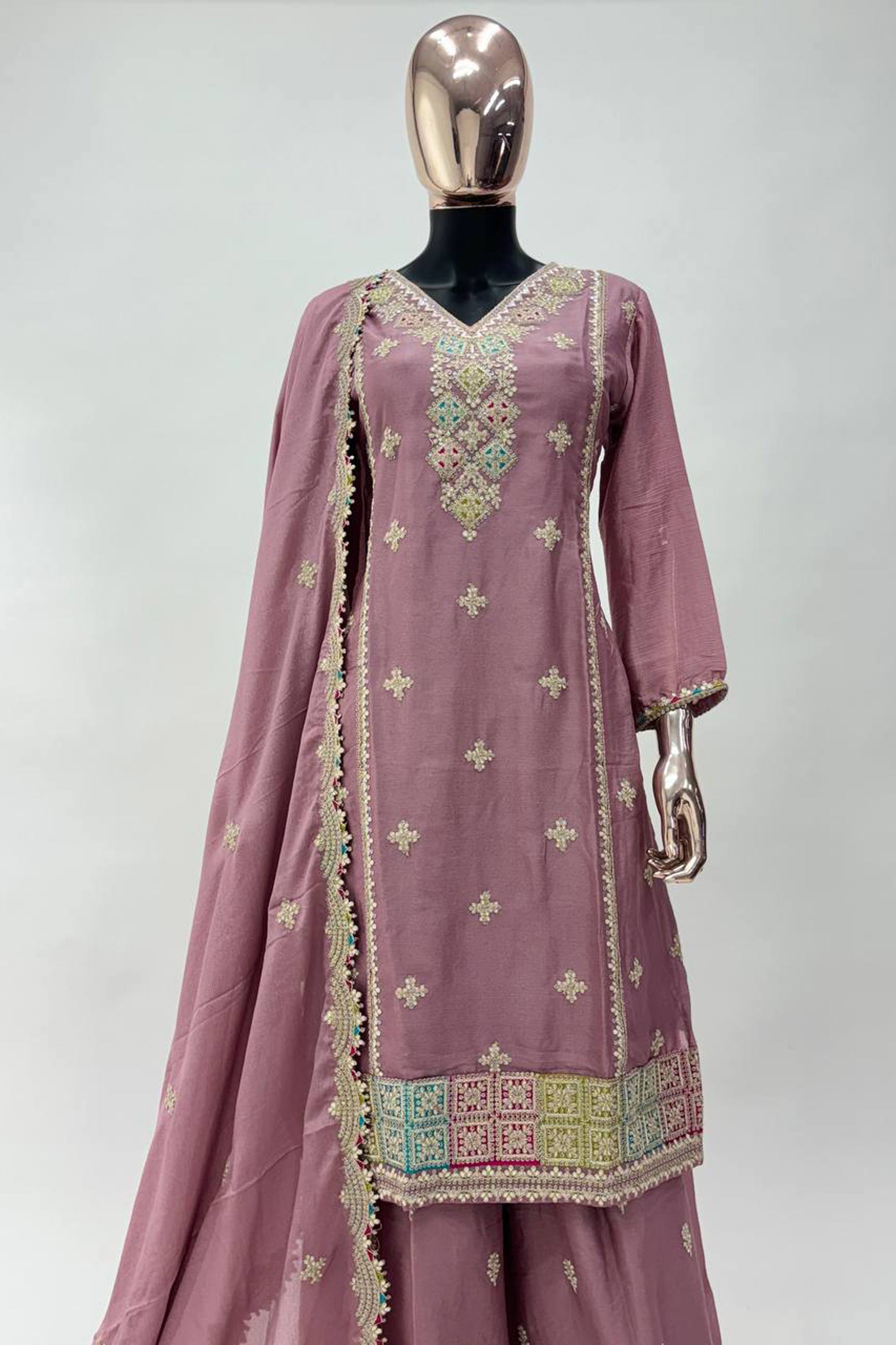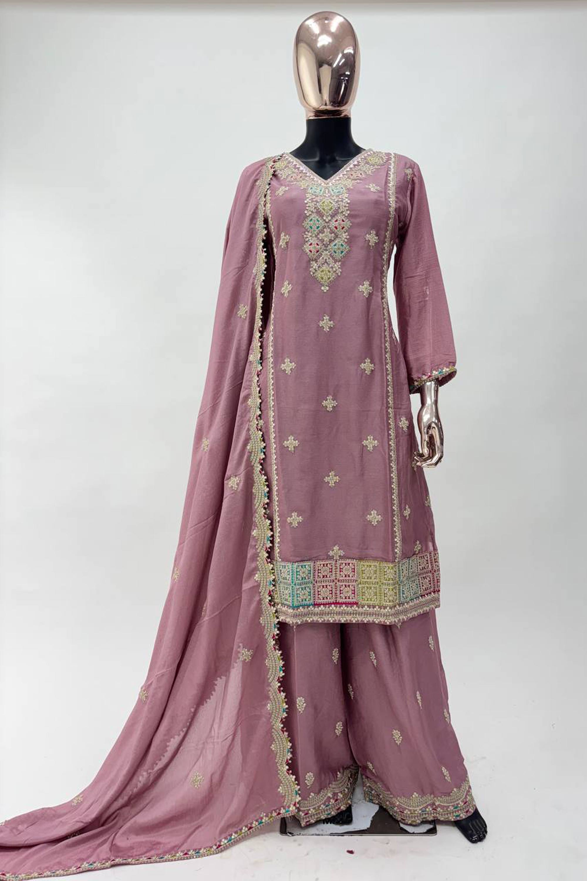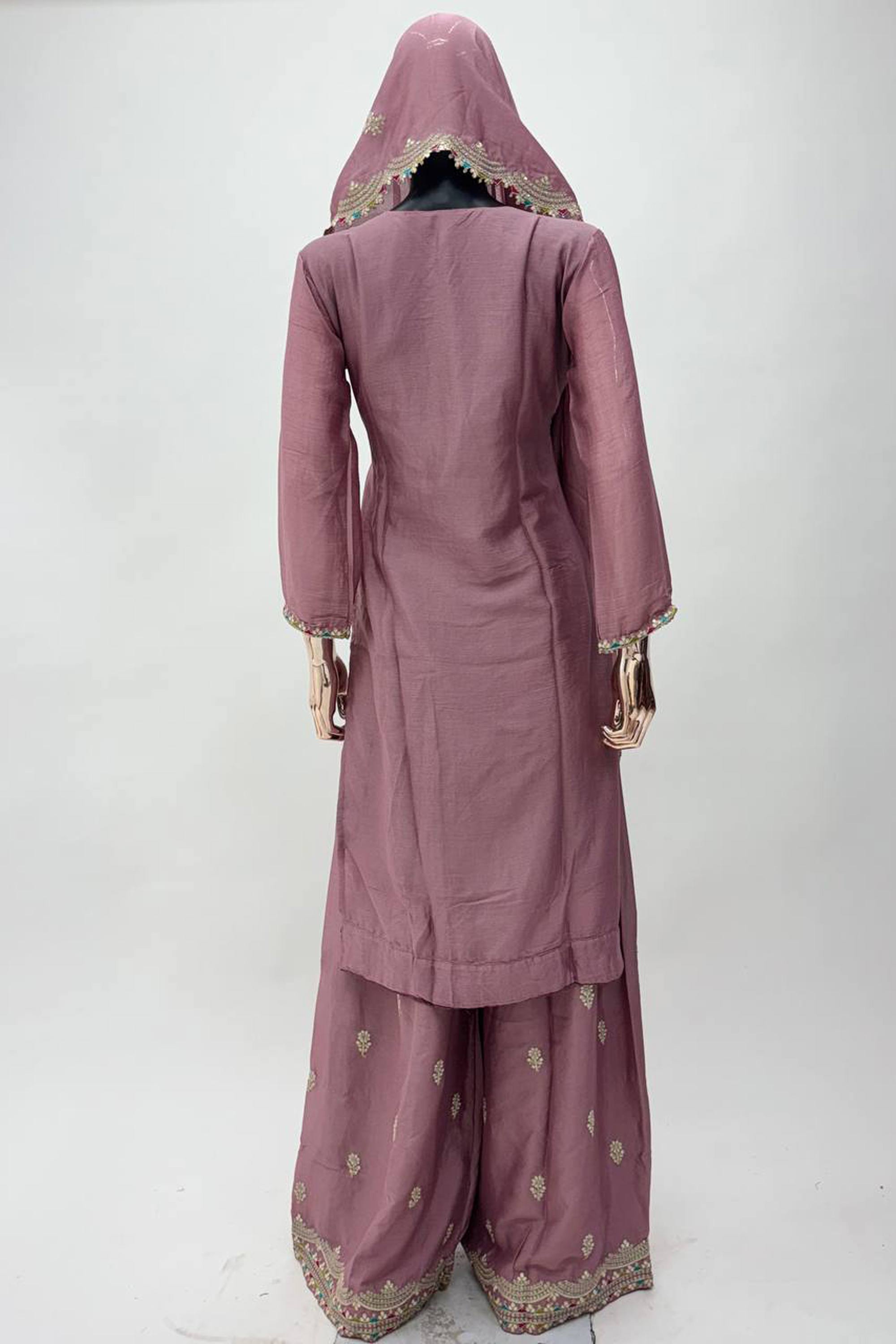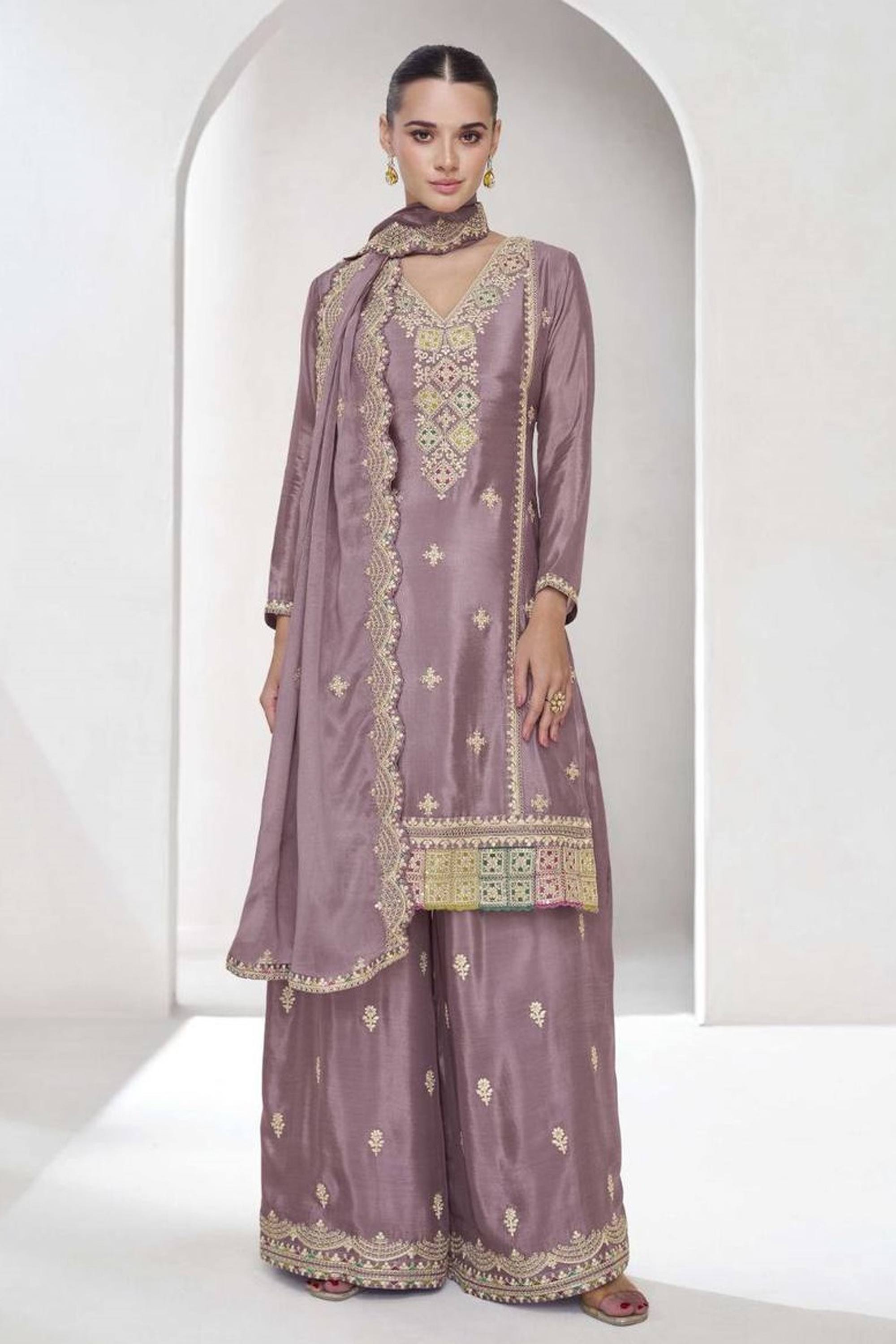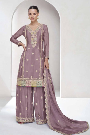 Lavender Function Wear Chinon Embroidered Readymade Palazzo Suit
