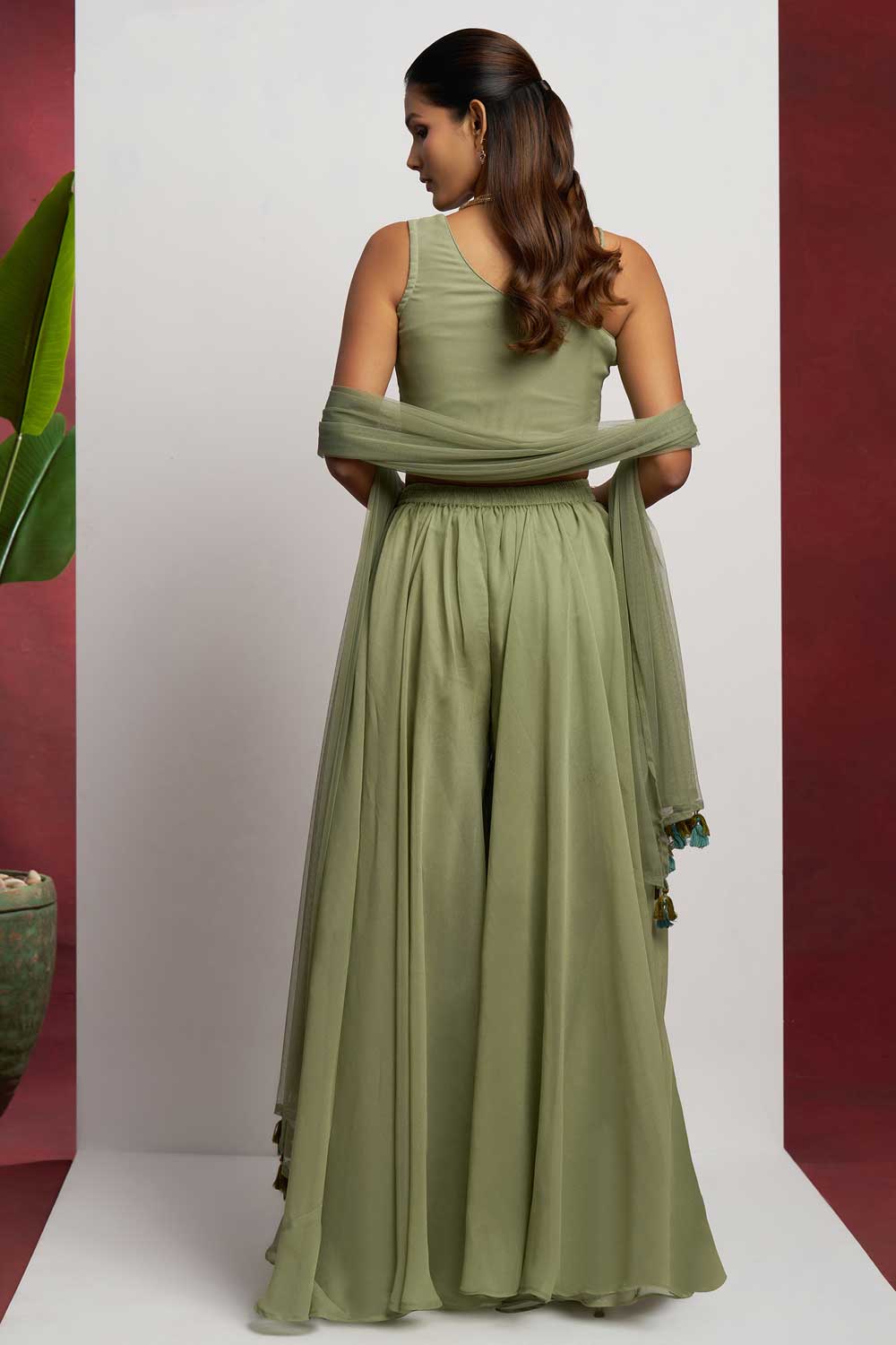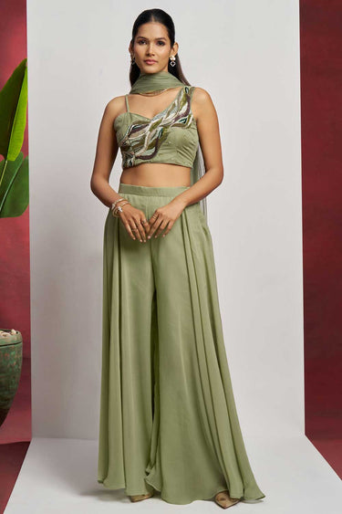 Step into the spotlight with this enchanting readymade Sharara suit, crafted to dazzle at every function. The top and bottom are made from premium Georgette fabric, offering a graceful fall and luxurious feel. Intricate embroidery work elevates the ensemble, adding a touch of traditional charm to a modern silhouette. The ensemble is completed with a delicate Net dupatta that adds an ethereal flair, perfect for capturing those picture-perfect moments. Whether it's a festive gathering or a celebratory soirée, this outfit ensures you make an unforgettable impression. Slight color variations may occur due to digital photography.