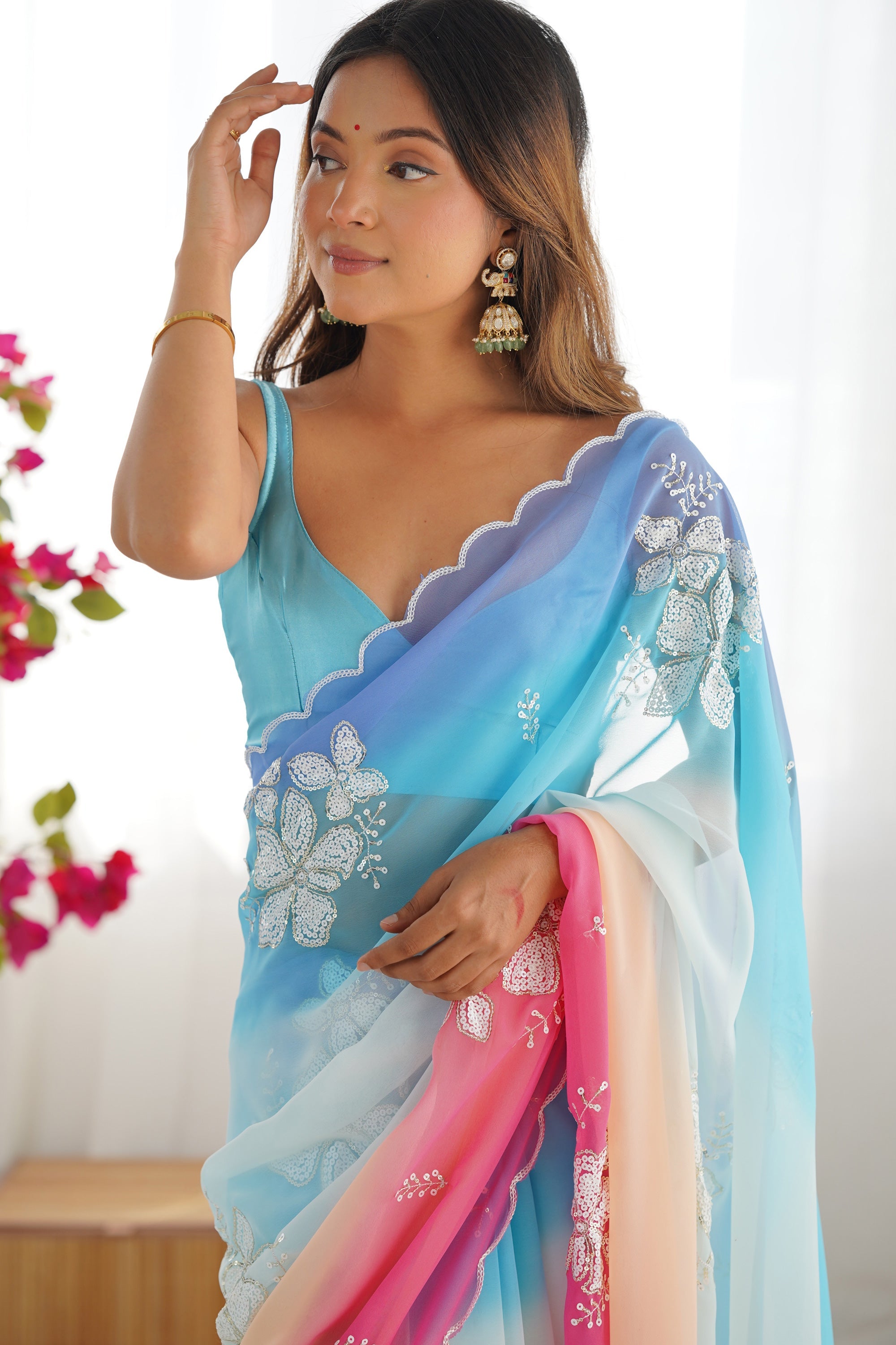 Sky Blue Sequins Work Georgette Casual Saree With Blouse