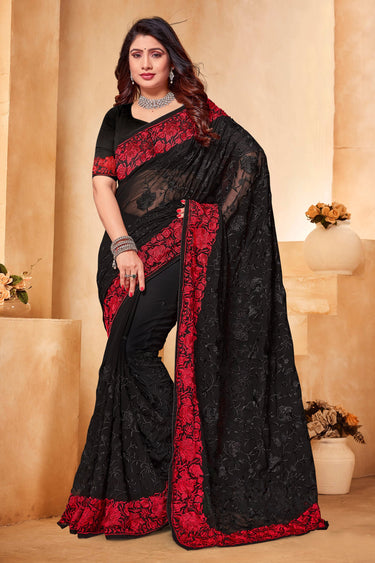 Embroidered Work Black Saree In Georgette Fabric