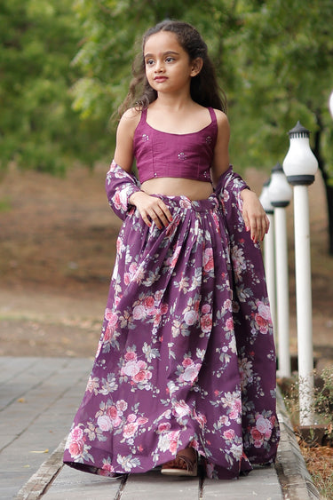 Purple Faux Gorgette Fabric Festive Wear Printed Kids Lehenga Choli