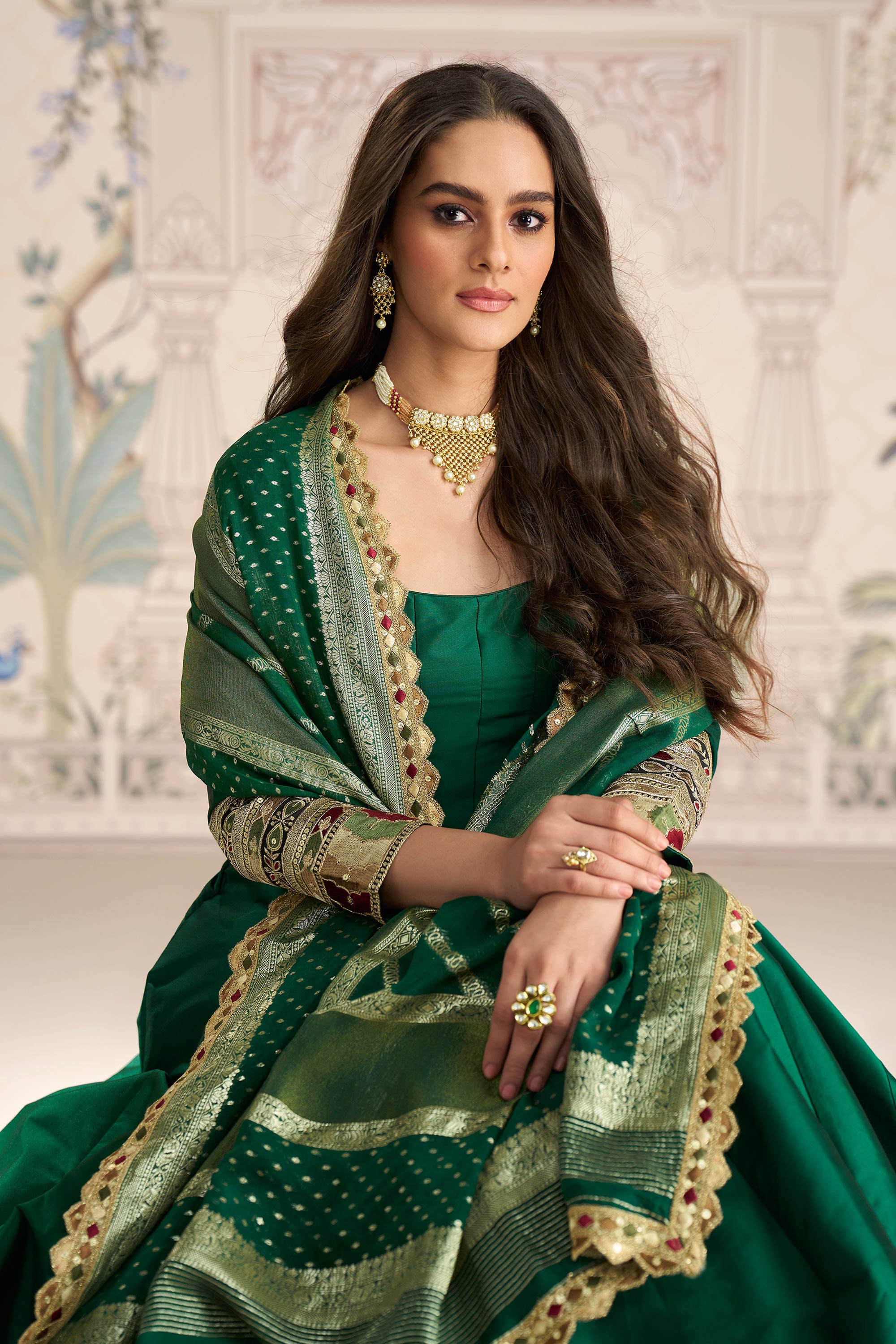 Dark Green Embroidered Art Silk Function Wear Gown With Dupatta