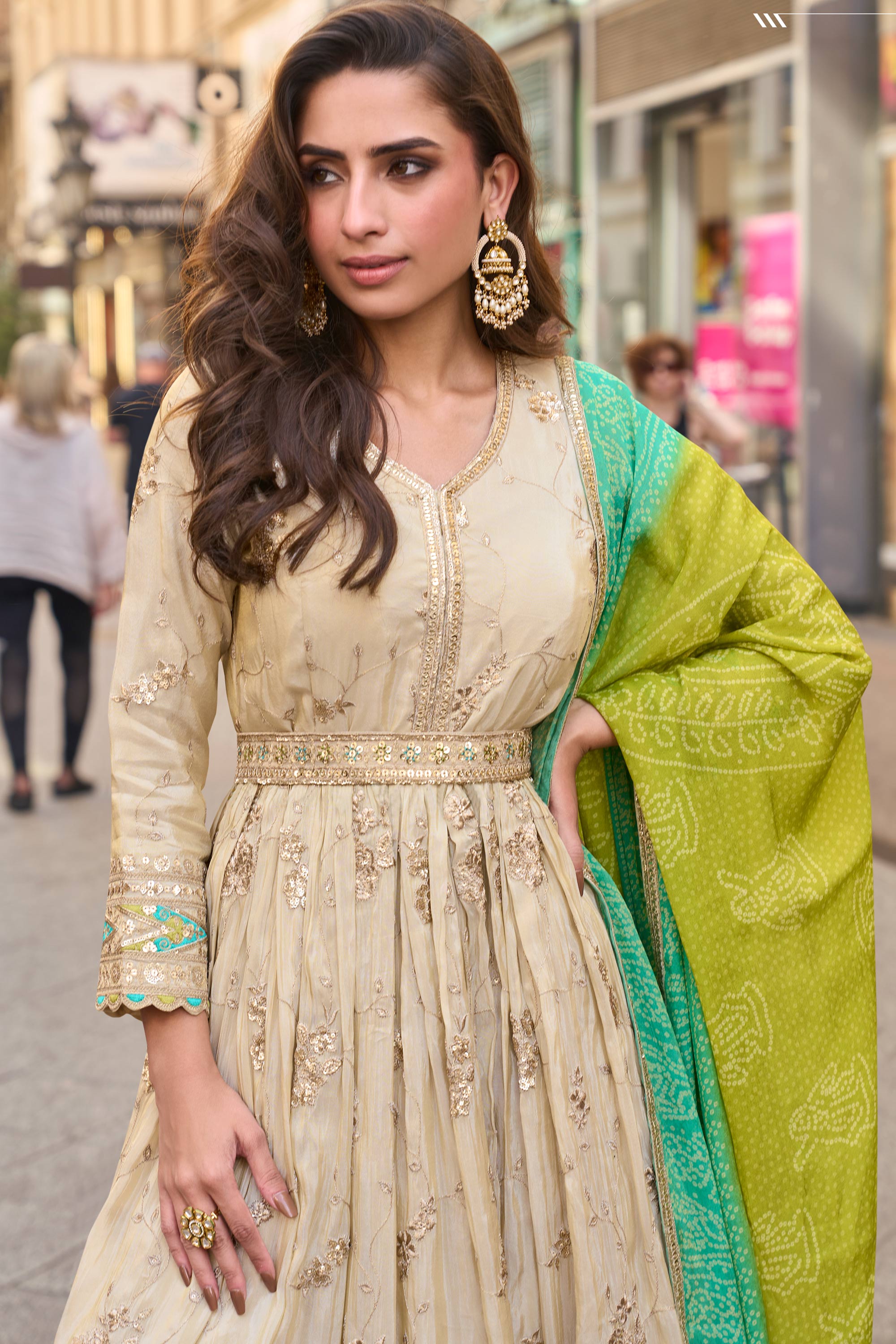 Embroidered Art Silk Beige Readymade Gown With Dupatta Set