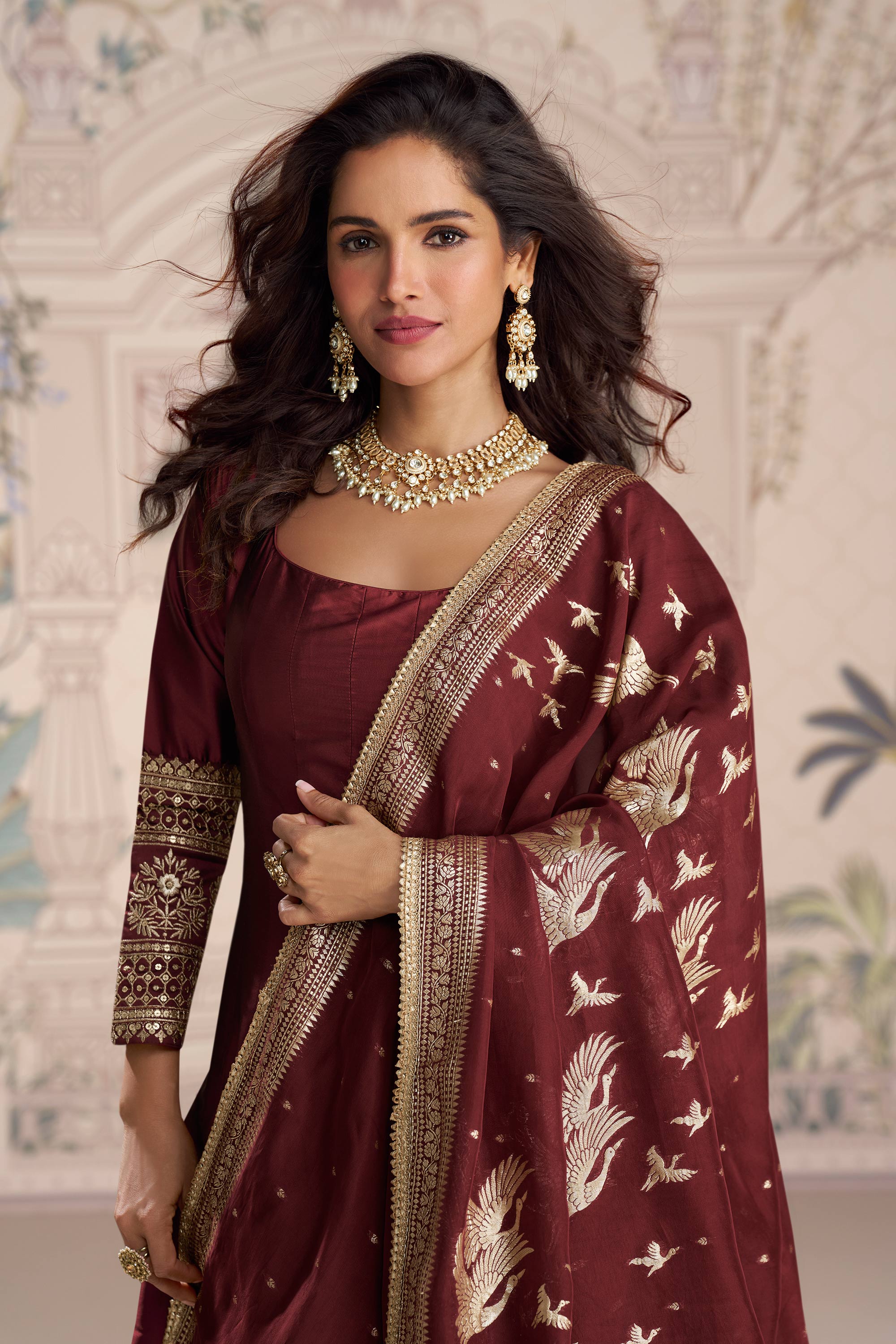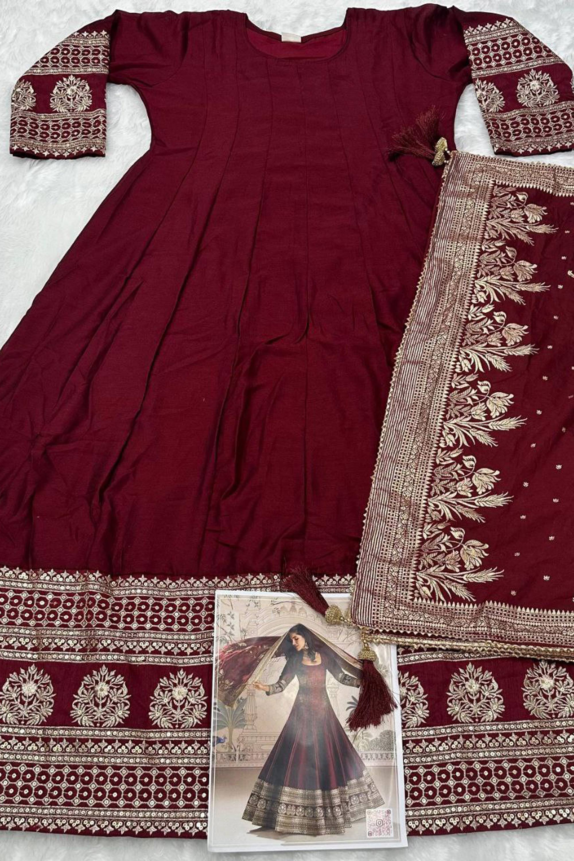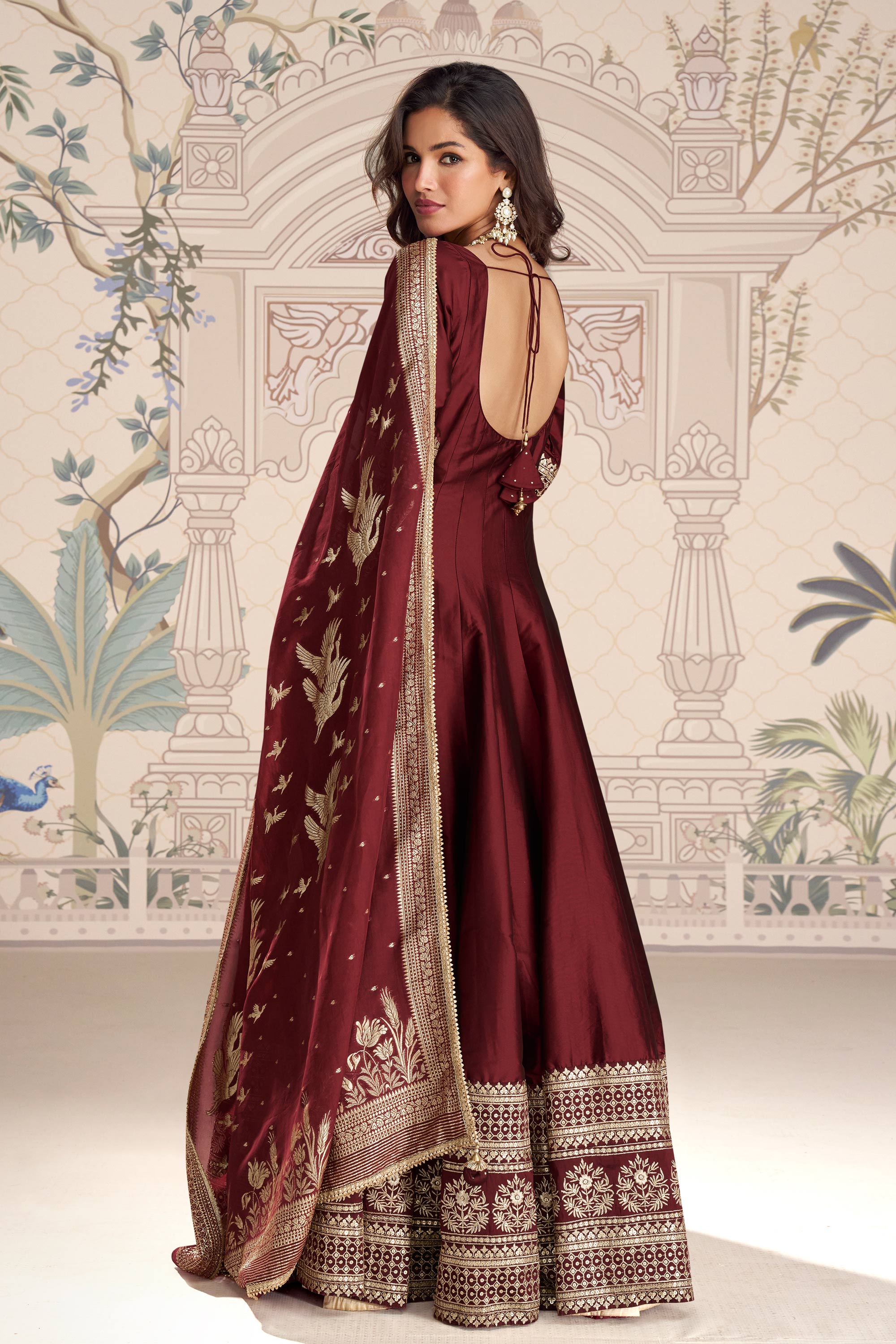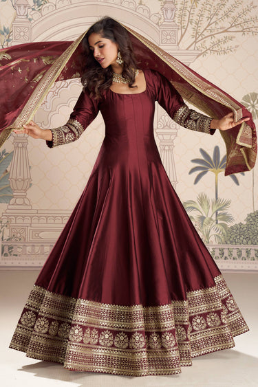 Embroidered Art Silk Wine Readymade Gown With Dupatta For Function Wear