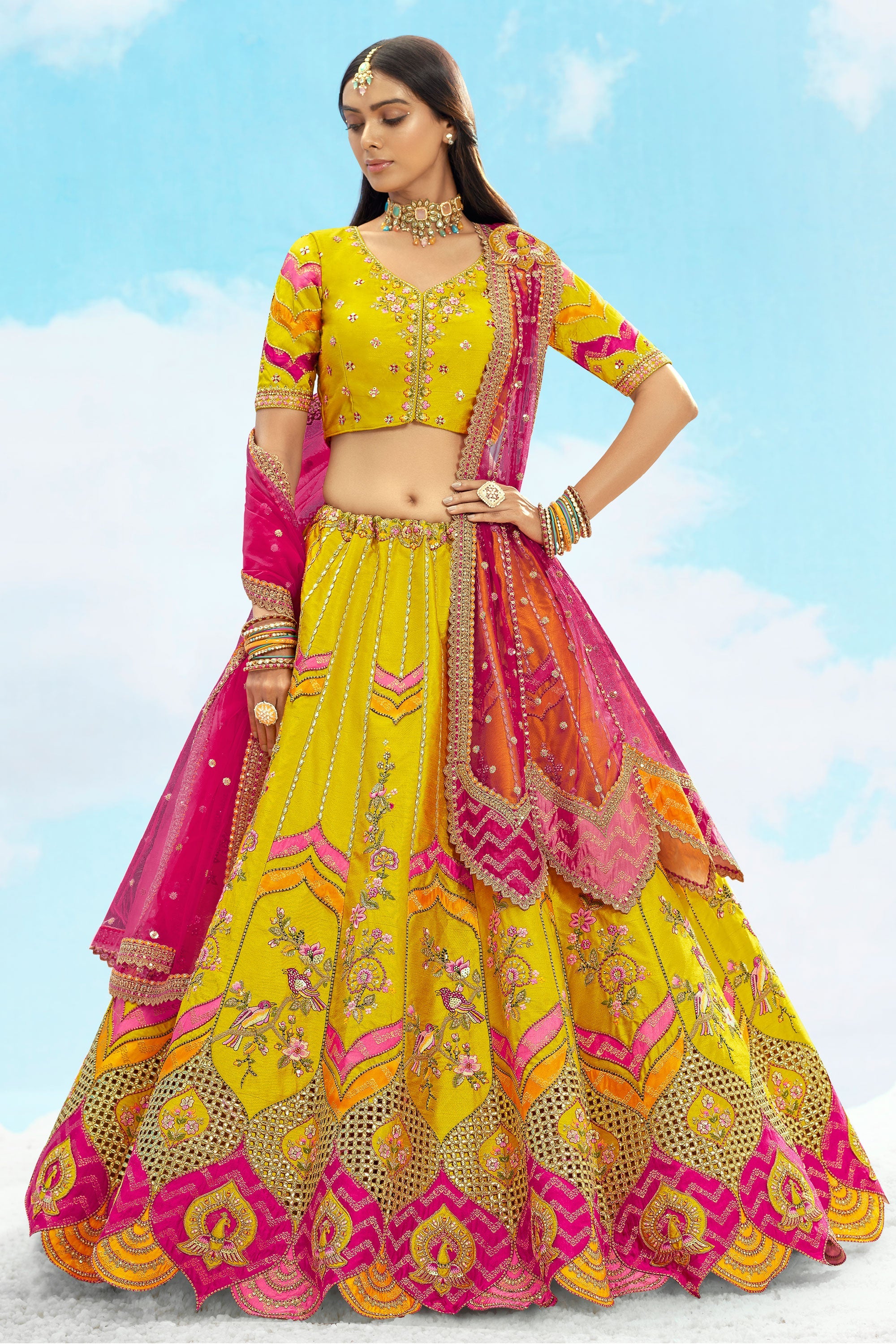 Embroidered Yellow Color Bridal Lehenga In Silk Fabric With Designer Choli