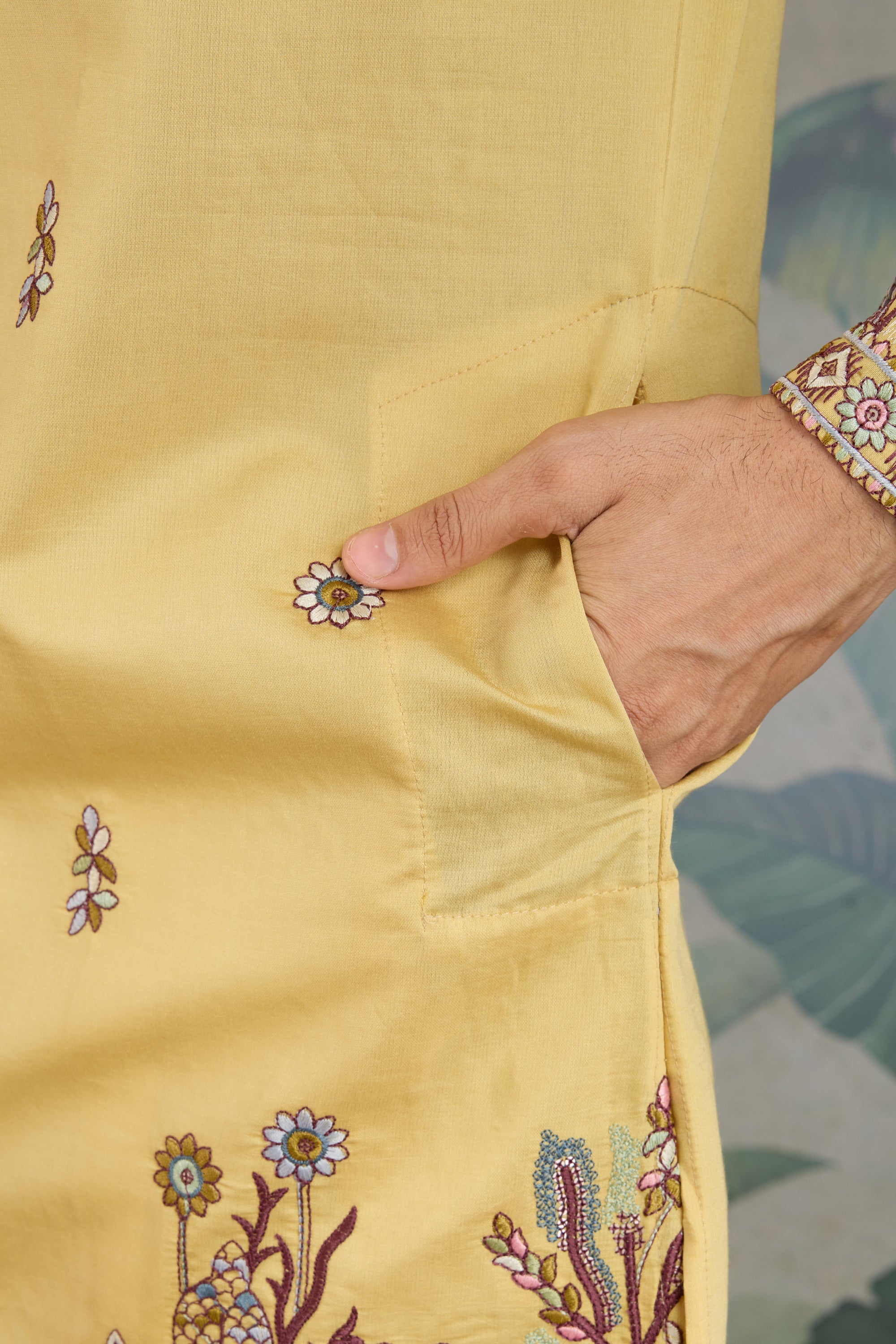 Yellow Readymade Sequins Embroidery Men Kurta With Dupatta