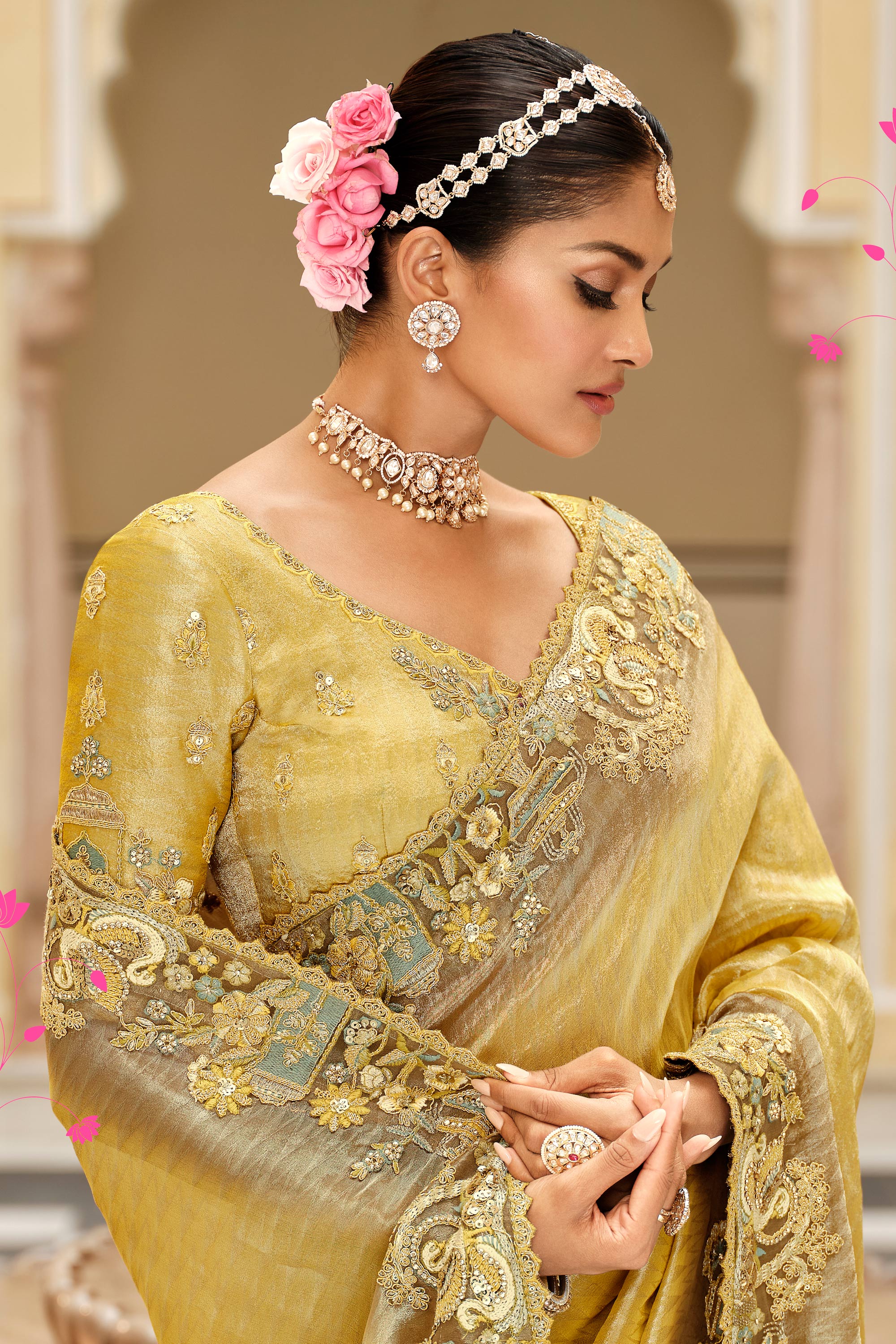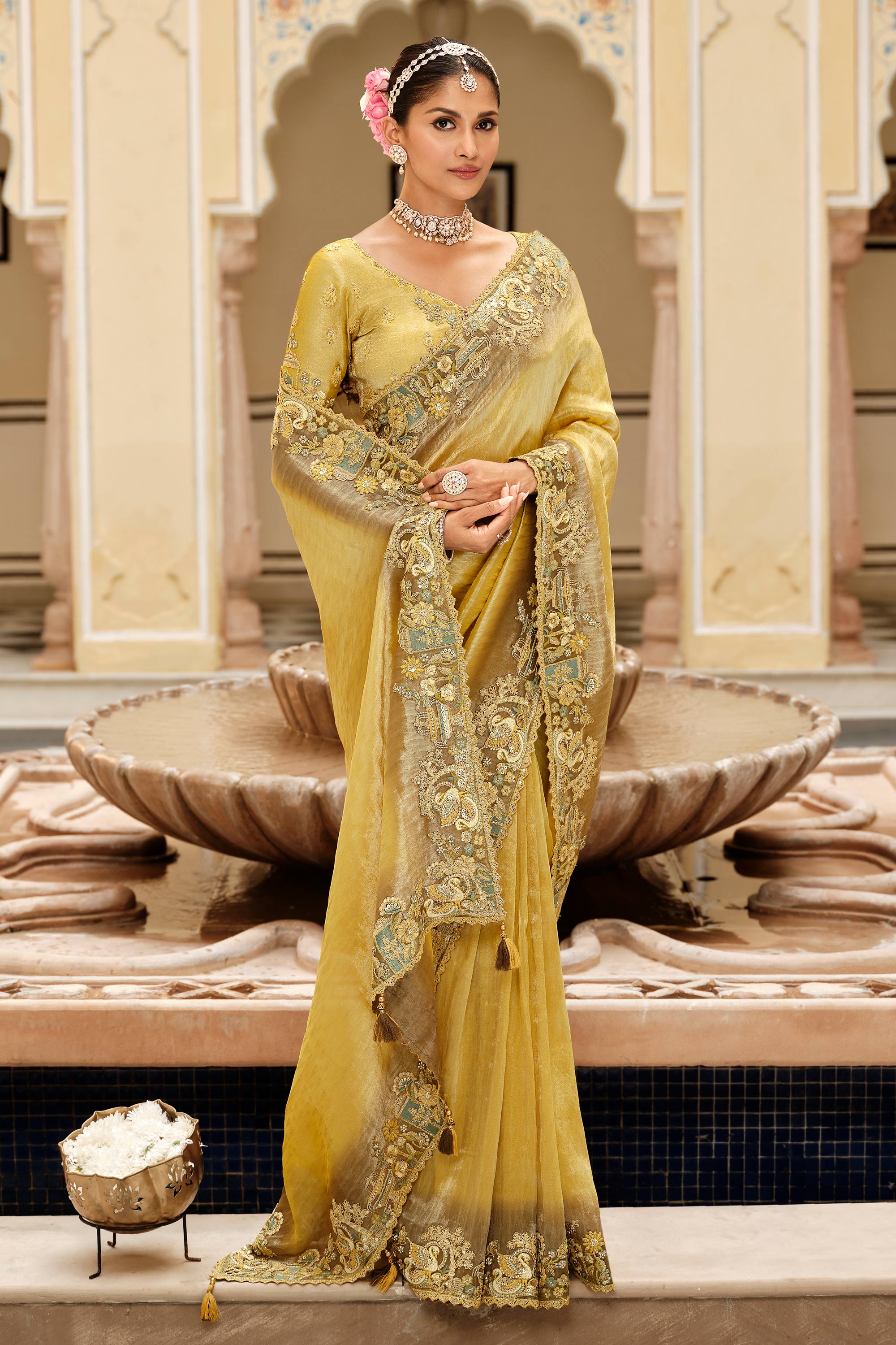 Yellow Viscose Jacquard Embroidered Border Work Saree For Function Wear