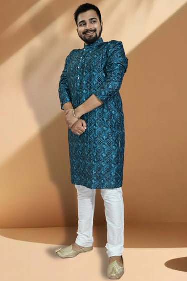 Teal Color Engaging Jacquard Fabric Readymade Kurta Pyjama For Men