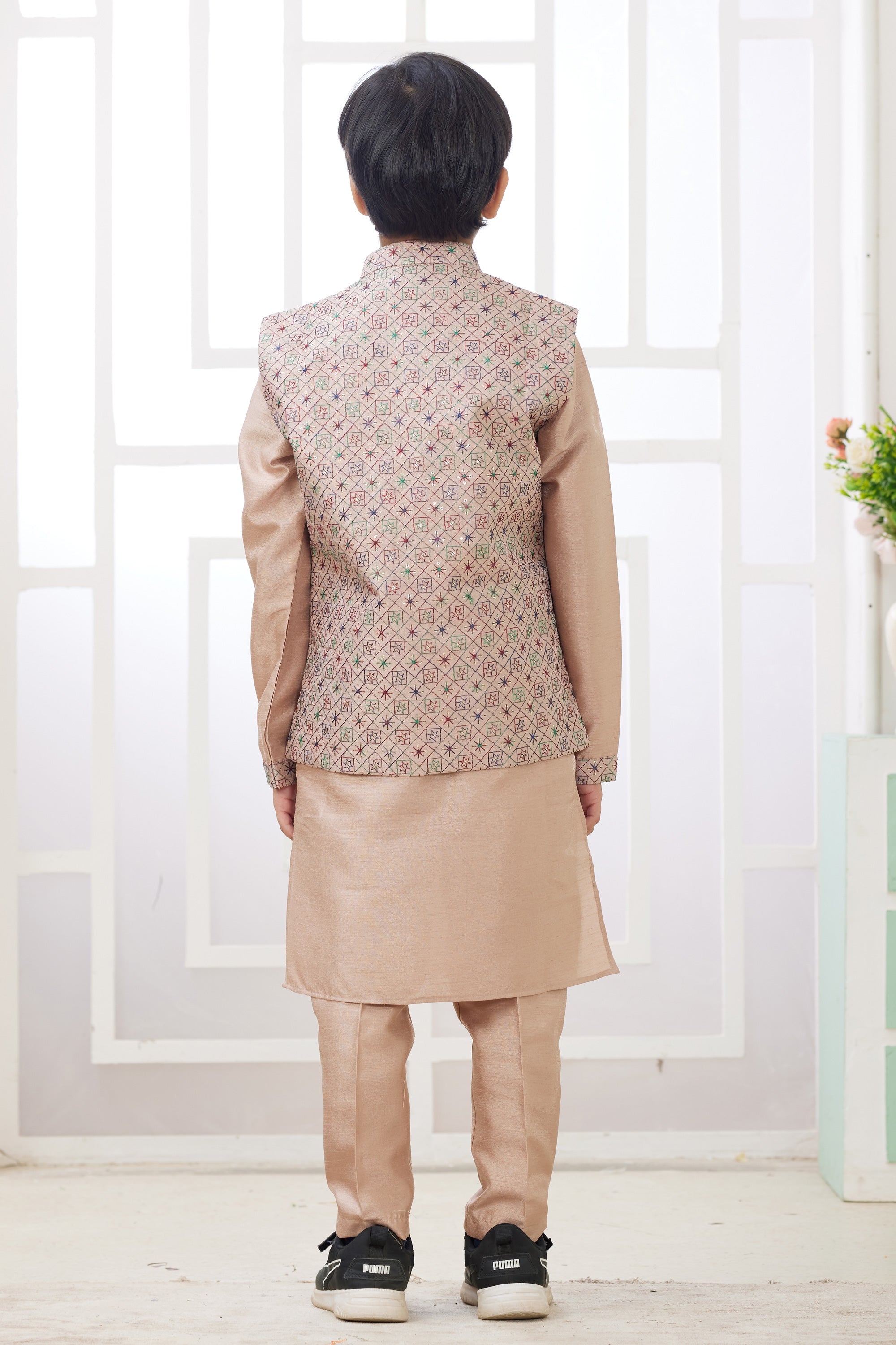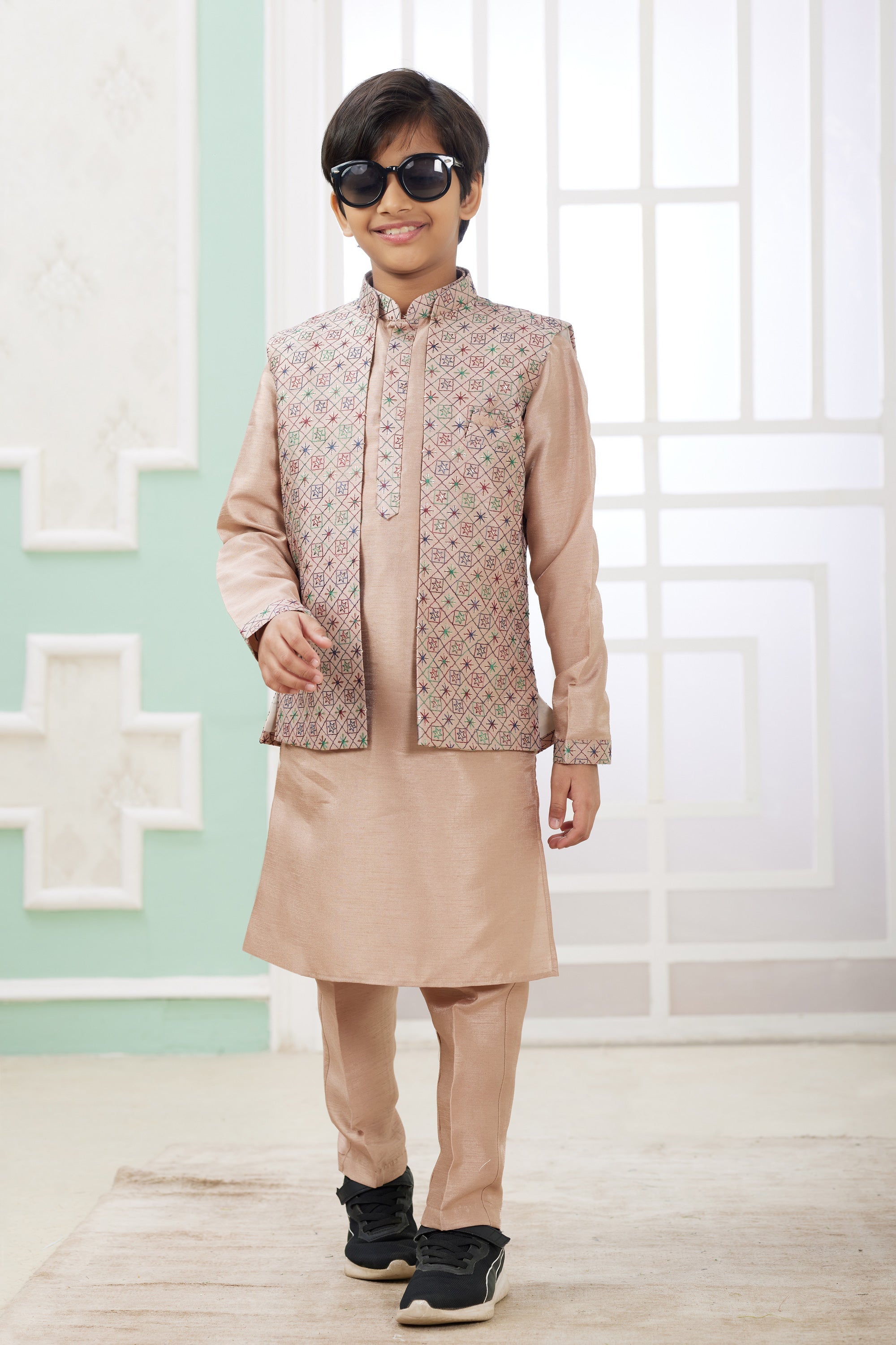 Beige Occasion Wear Readymade Boys Kurta Pyjama With Designer Jacket