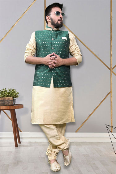 Art Silk Fabric Readymade Men Stylish Kurta Pyjama With Teal Color Jacket set