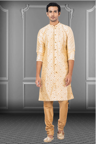 Beige Reception Wear Readymade Dhupion Fabric Kurta Pyjama For Men