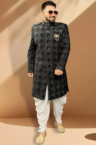 Black Gorgeous Silk Fabric Wedding Wear Readymade Peshawari Style Indo Western For Men