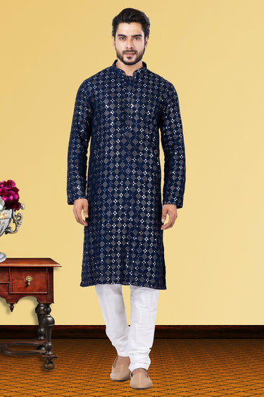 Navy Blue Georgette Fabric Readymade Kurta Pyjama For Men