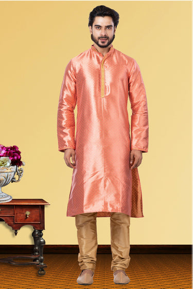 Peach Pretty Readymade Kurta Pyjama For Men In Jacquard Fabric
