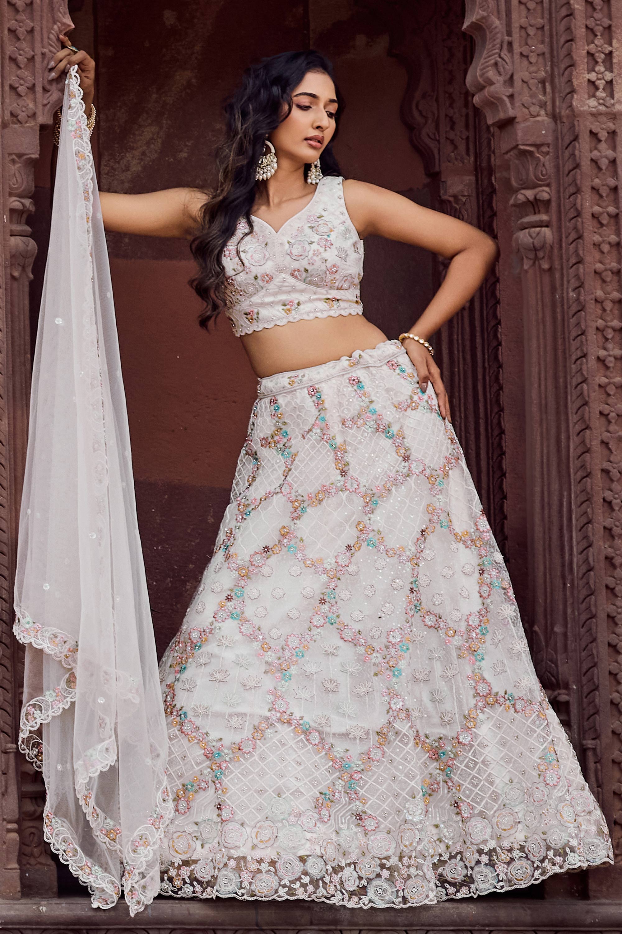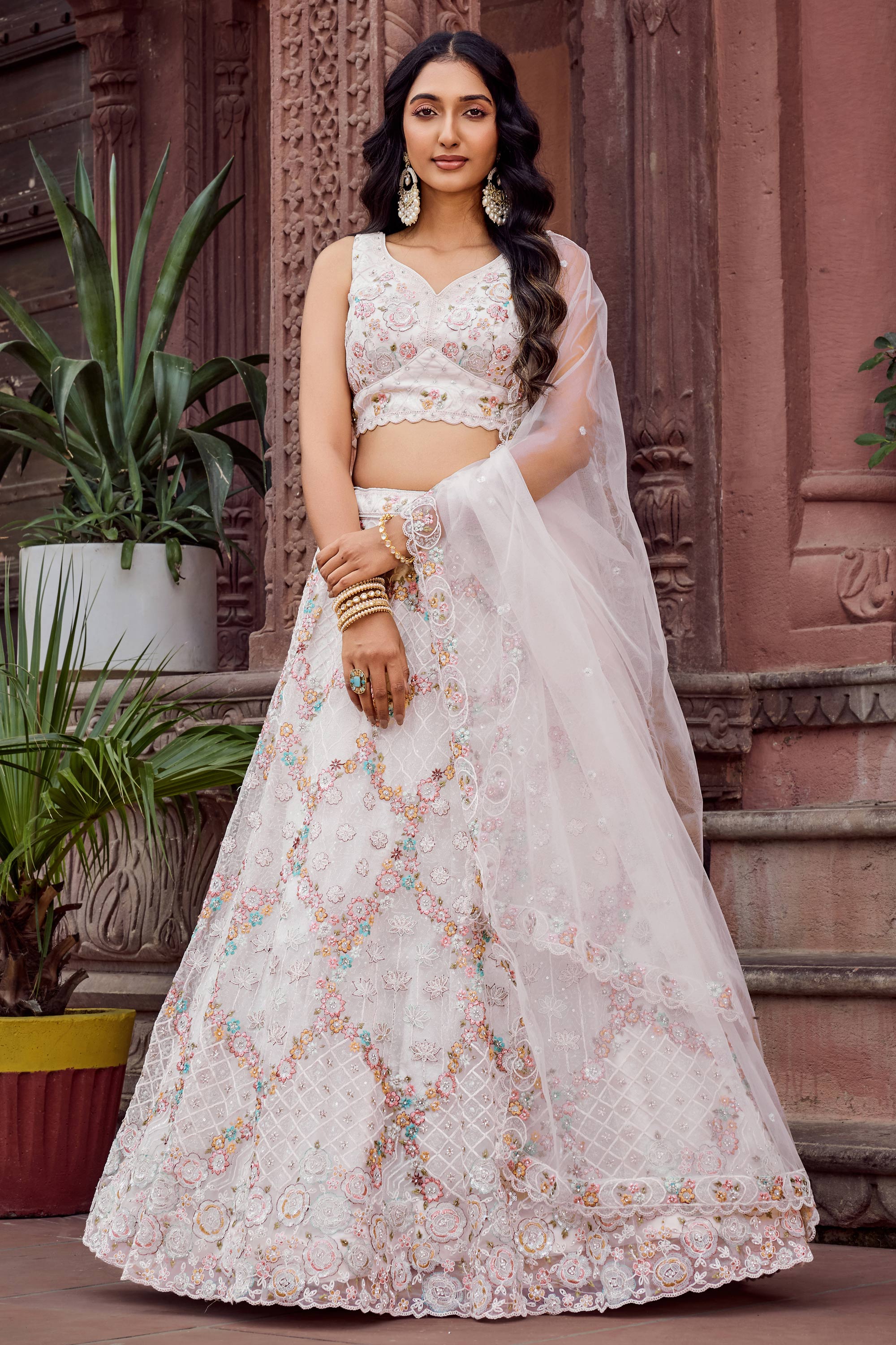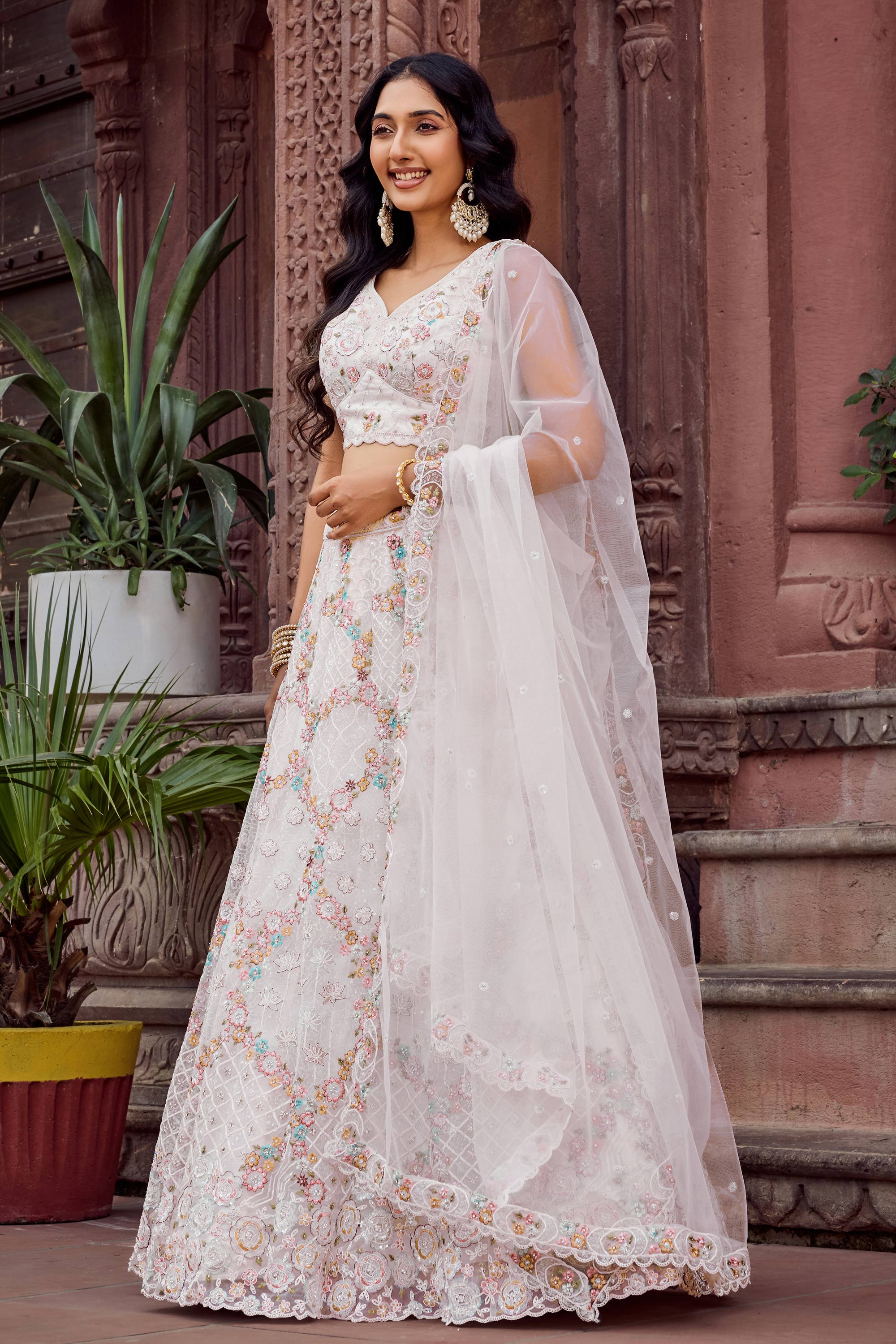 Off White Wedding Wear Embroidered Net Fabric Lehenga Choli