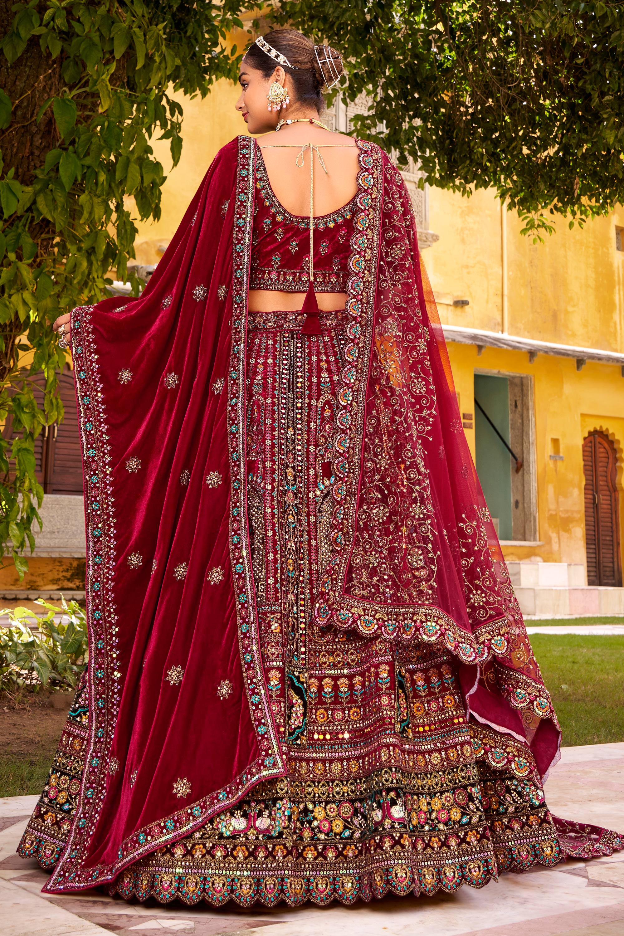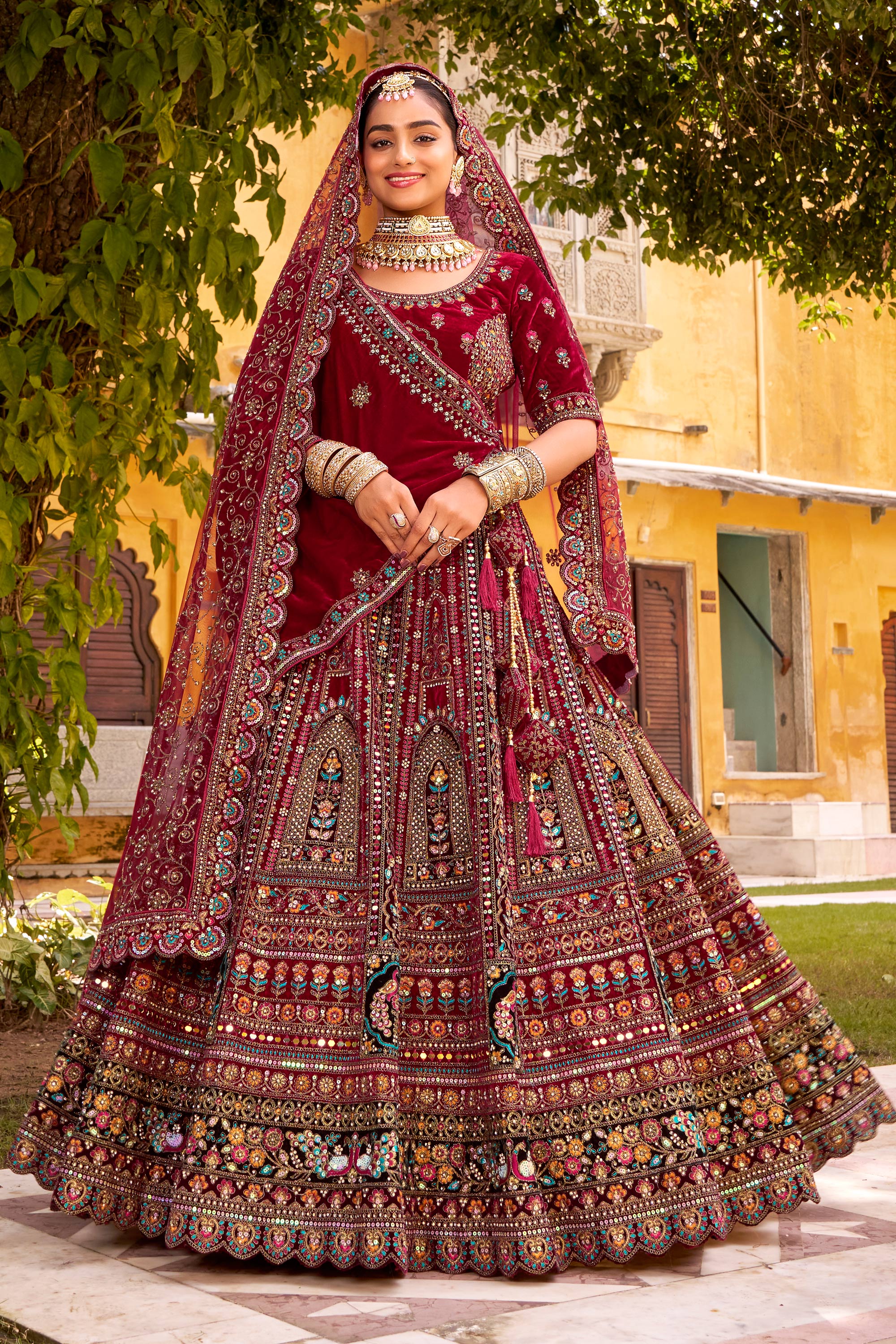 Velvet Maroon Bridal Lehenga Choli