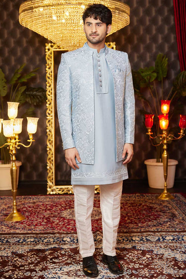 Art Silk Stunning Light Cyan Color Wedding Wear 3 Piece Indo Western