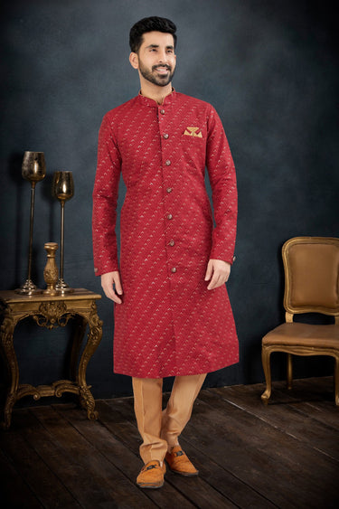 Banarasi Jacquard Lovely Red Color Festive Wear Readymade Indo Western Suit For Men