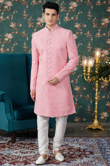Enriching Pink Color Wedding Wear Readymade Art Silk Fabric Sherwani For Men