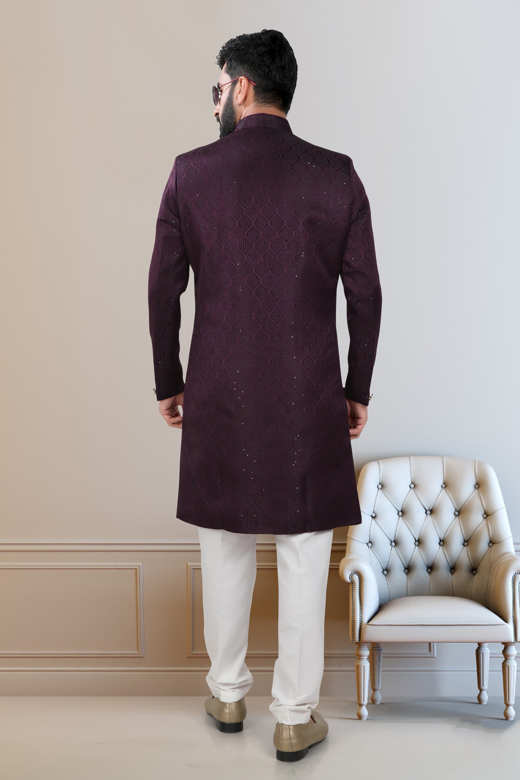 Fancy Fabric Designer Wedding Wear Readymade Indo Western For Men In Wine Color