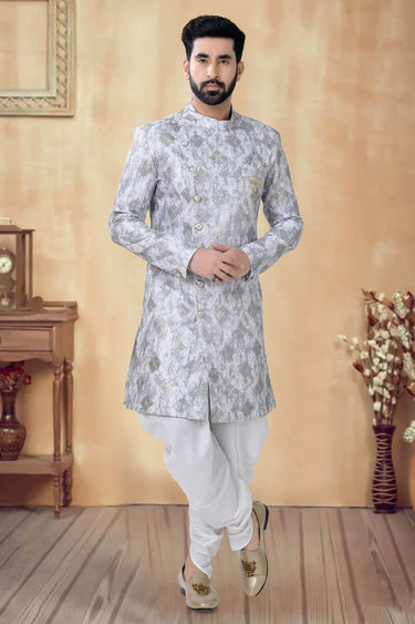 Grey Gorgeous Silk Fabric Wedding Wear Readymade Indo Western For Men