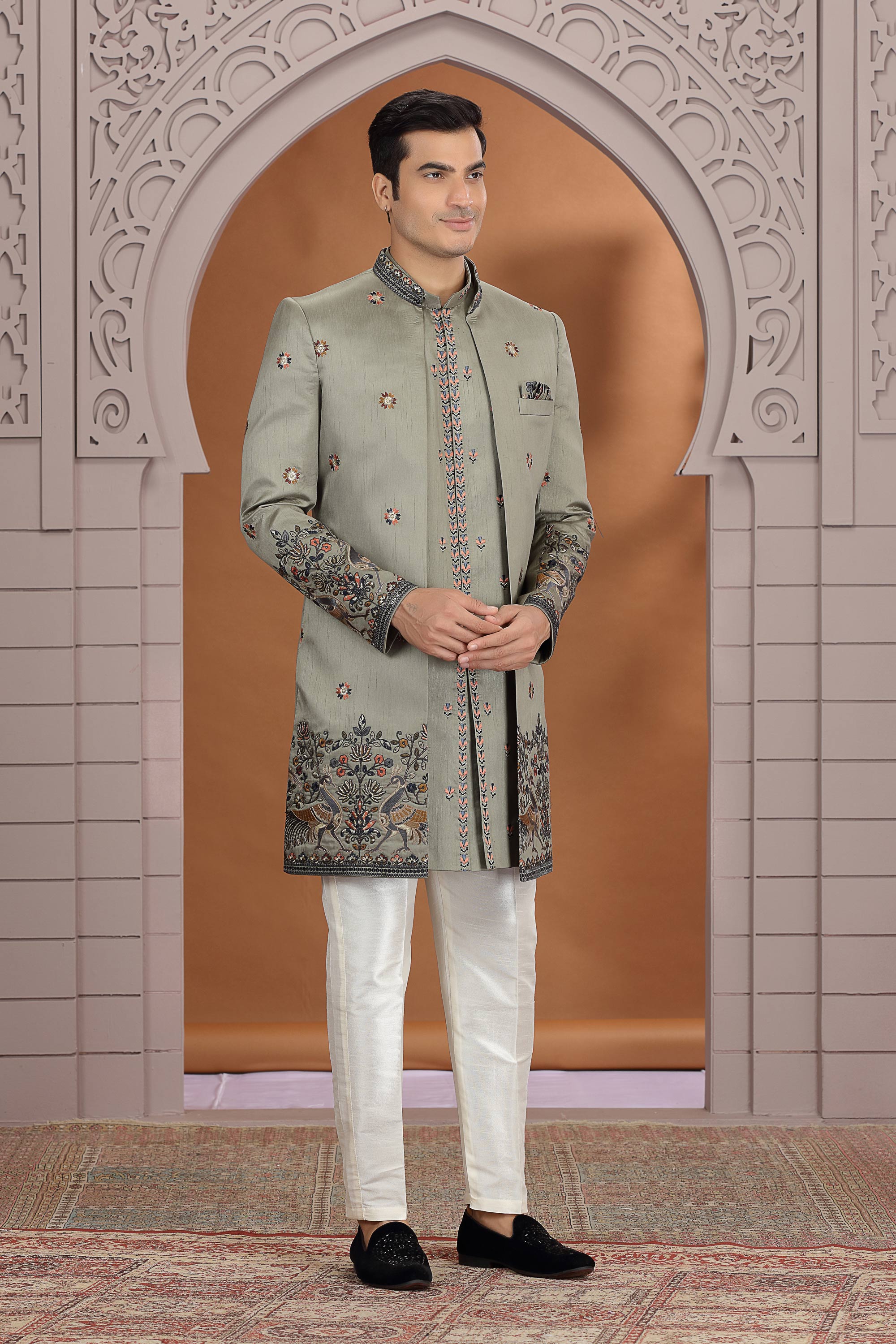 Light Olive Green Embroidered Readymade 3 Piece Indo Western For Men