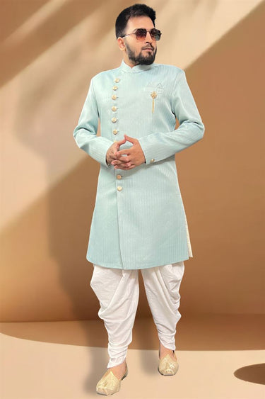 Majestic Light Cyan Color Jacquard Fabric Peshawari Style Indo Western Set