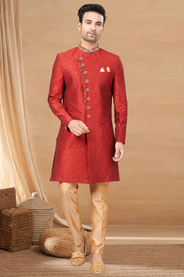 Red Color Jacquard Fabric Captivating Readymade Indo Western For Men