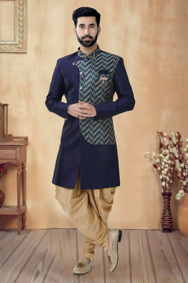 Silk Fabric Navy Blue Color Festive Wear Trendy Readymade Men Indo Western