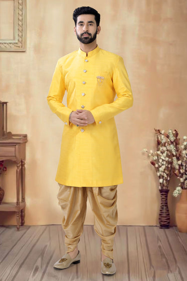 Silk Yellow Color Wedding Wear Readymade Indo Western For Men