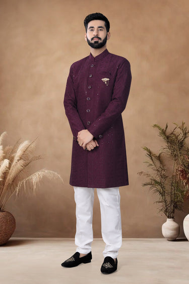 Wine Silk Wedding Wear Striking Readymade Indo Western For Men
