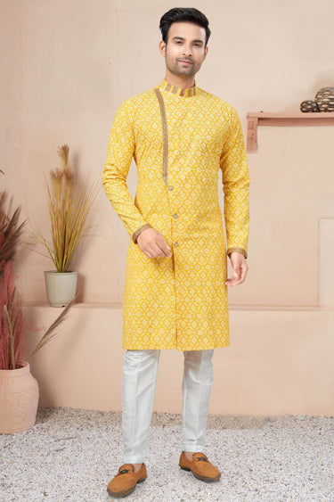 Yellow Color Cotton Fabric Printed Designer Readymade Indo Western For Men