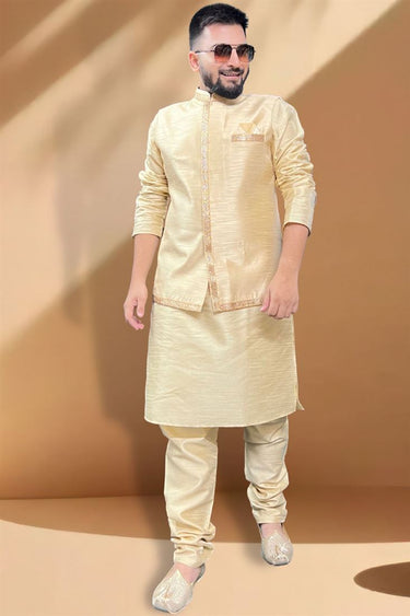 Captivating Silk Fabric Function Wear Cream Kurta Pyjama With Golden Color Jacket