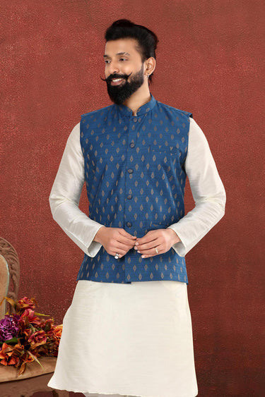 Cotton Silk Fabric Navy Blue Color Festive Wear Readymade Men Stylish Jacket