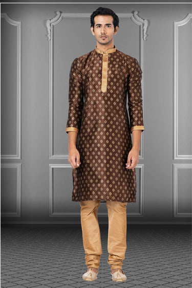 Dhupion Fabric Wedding Wear Readymade Kurta Pyjama For Men In Brown Color