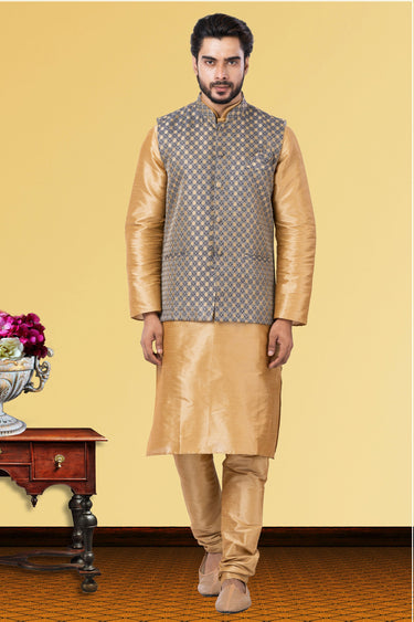 Dhupion Raw Silk Fabric Function Wear Readymade Cream Kurta Pyjama For Men With Jacket