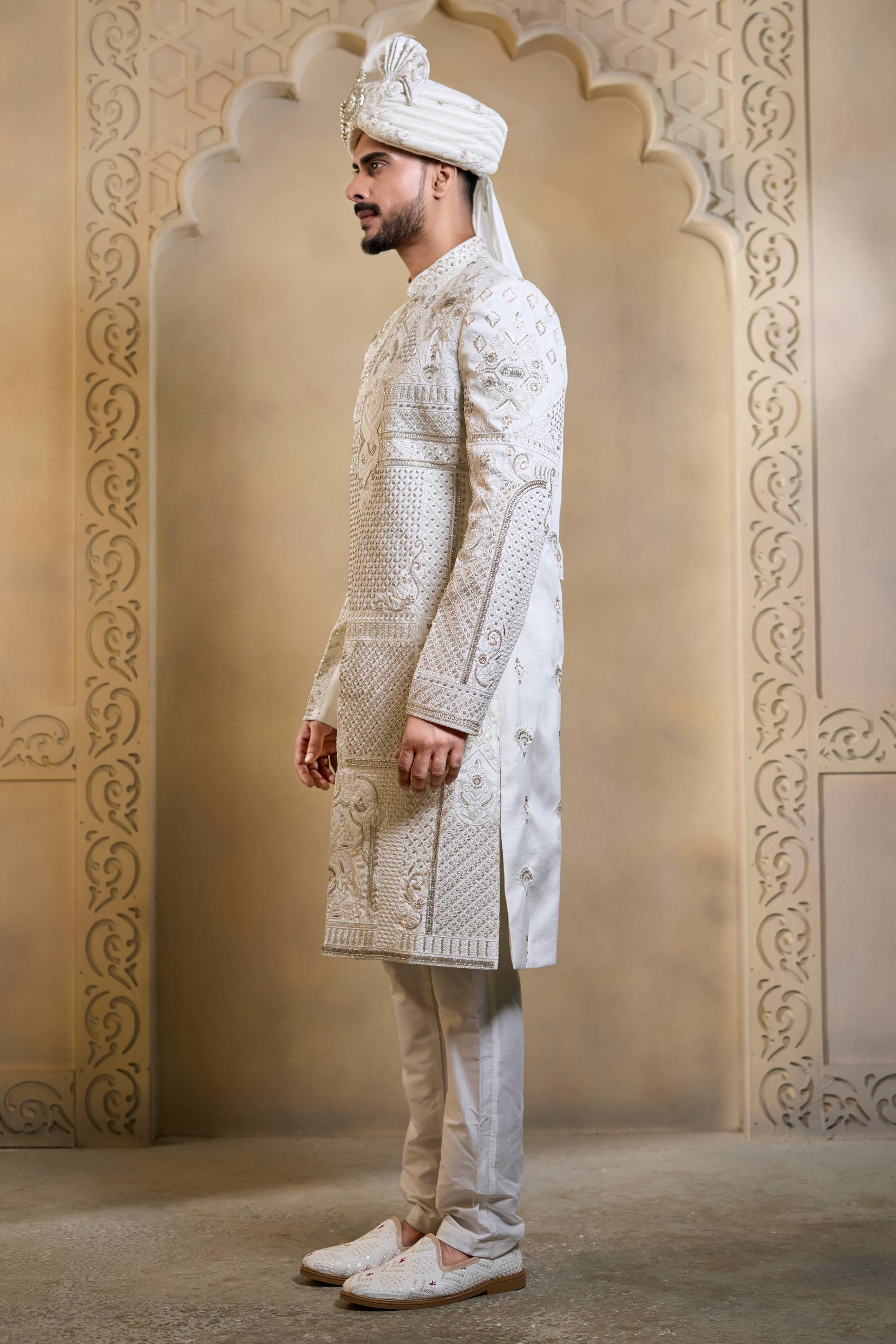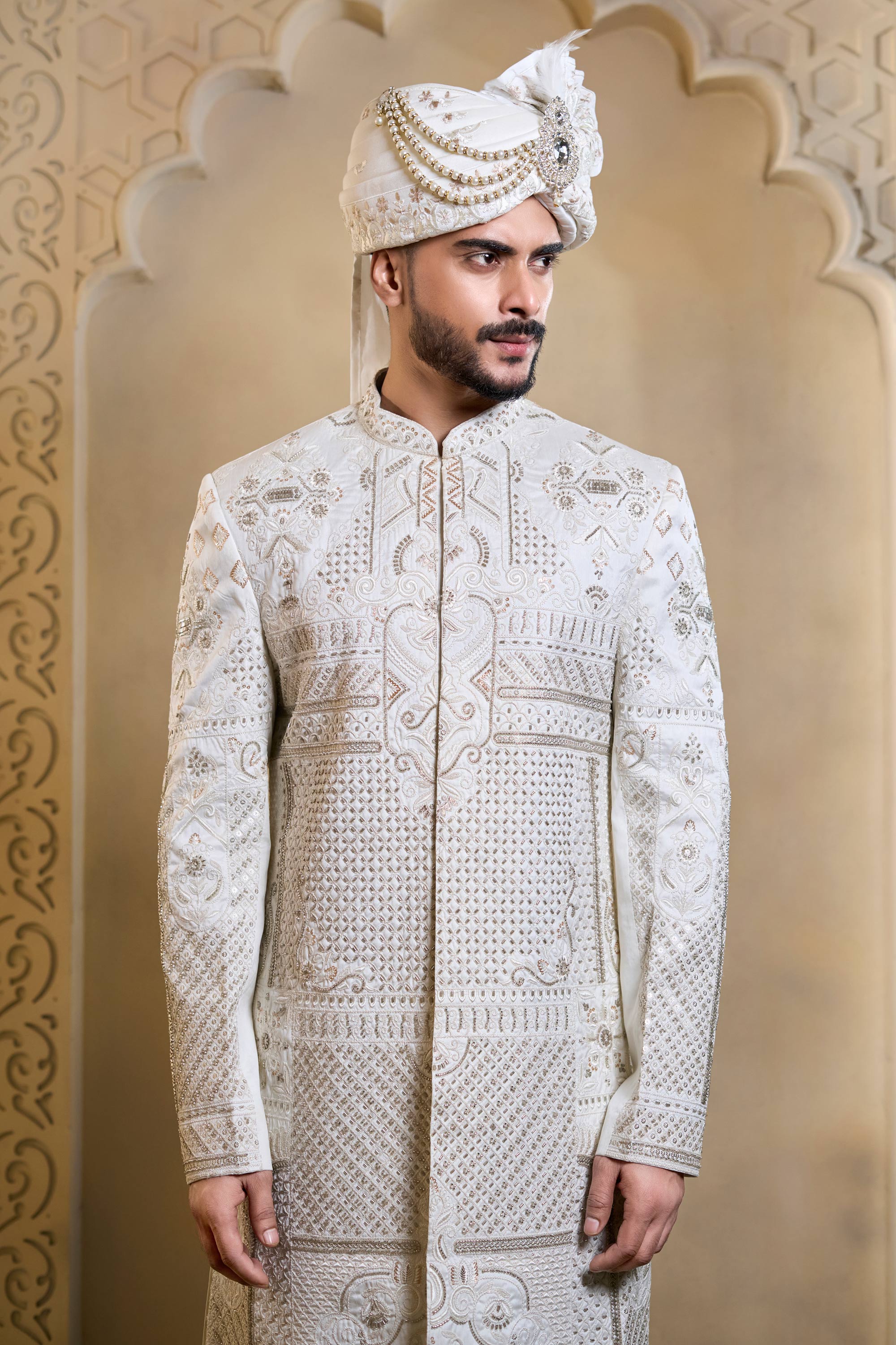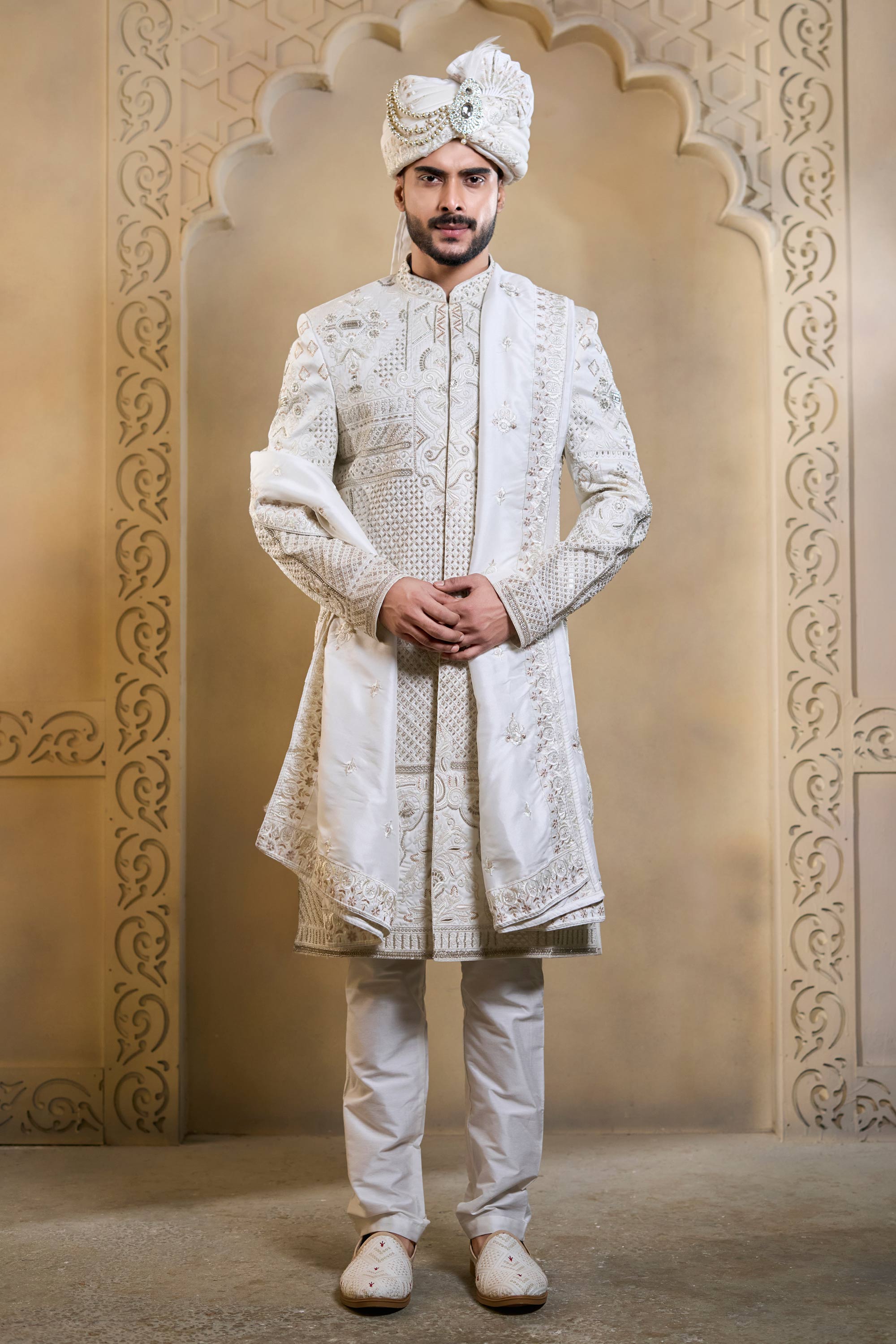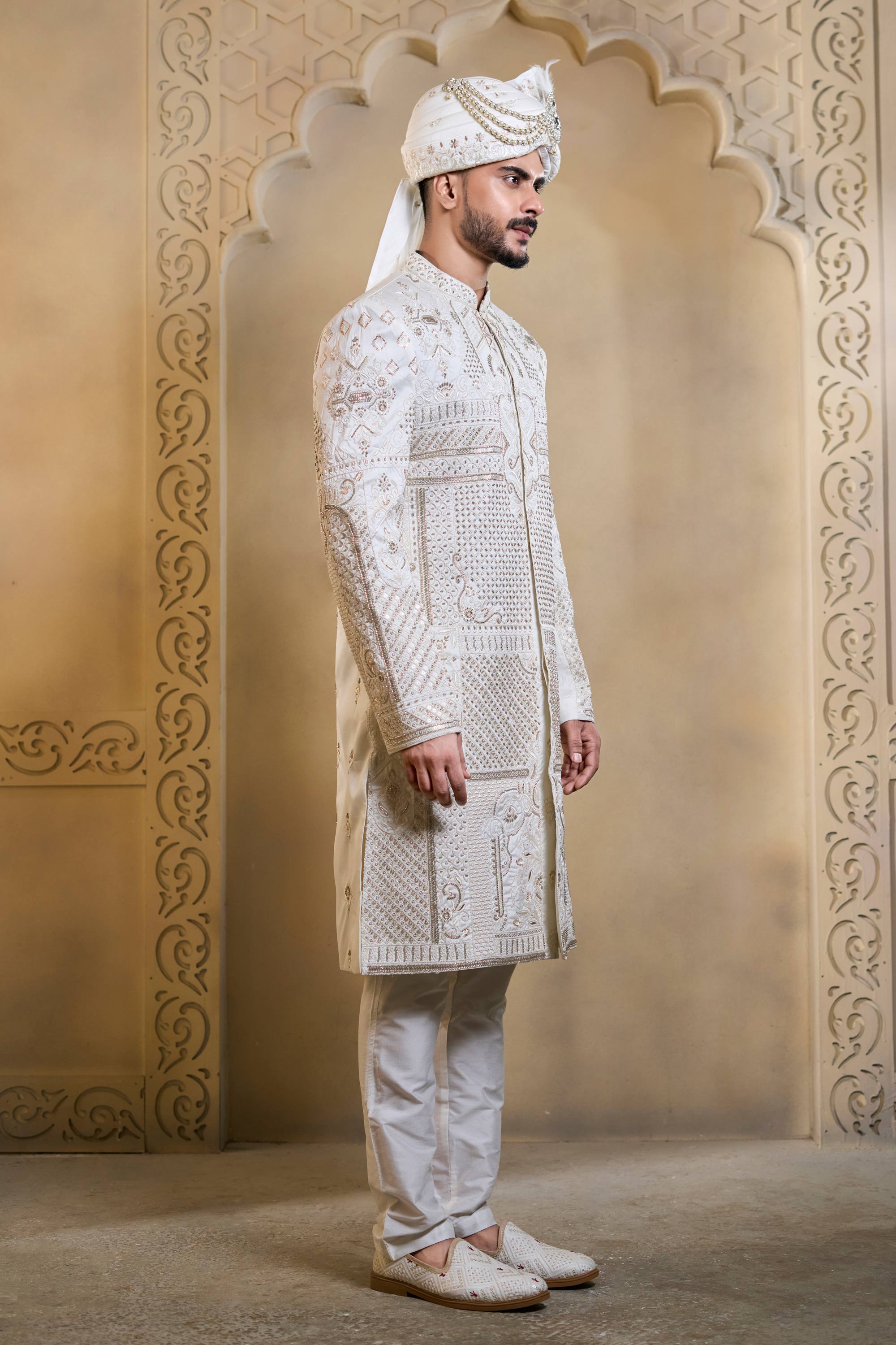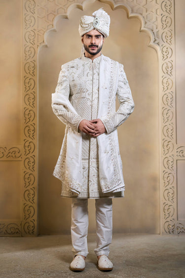 Embroidered Silk White Men Readymade Groom Sherwani