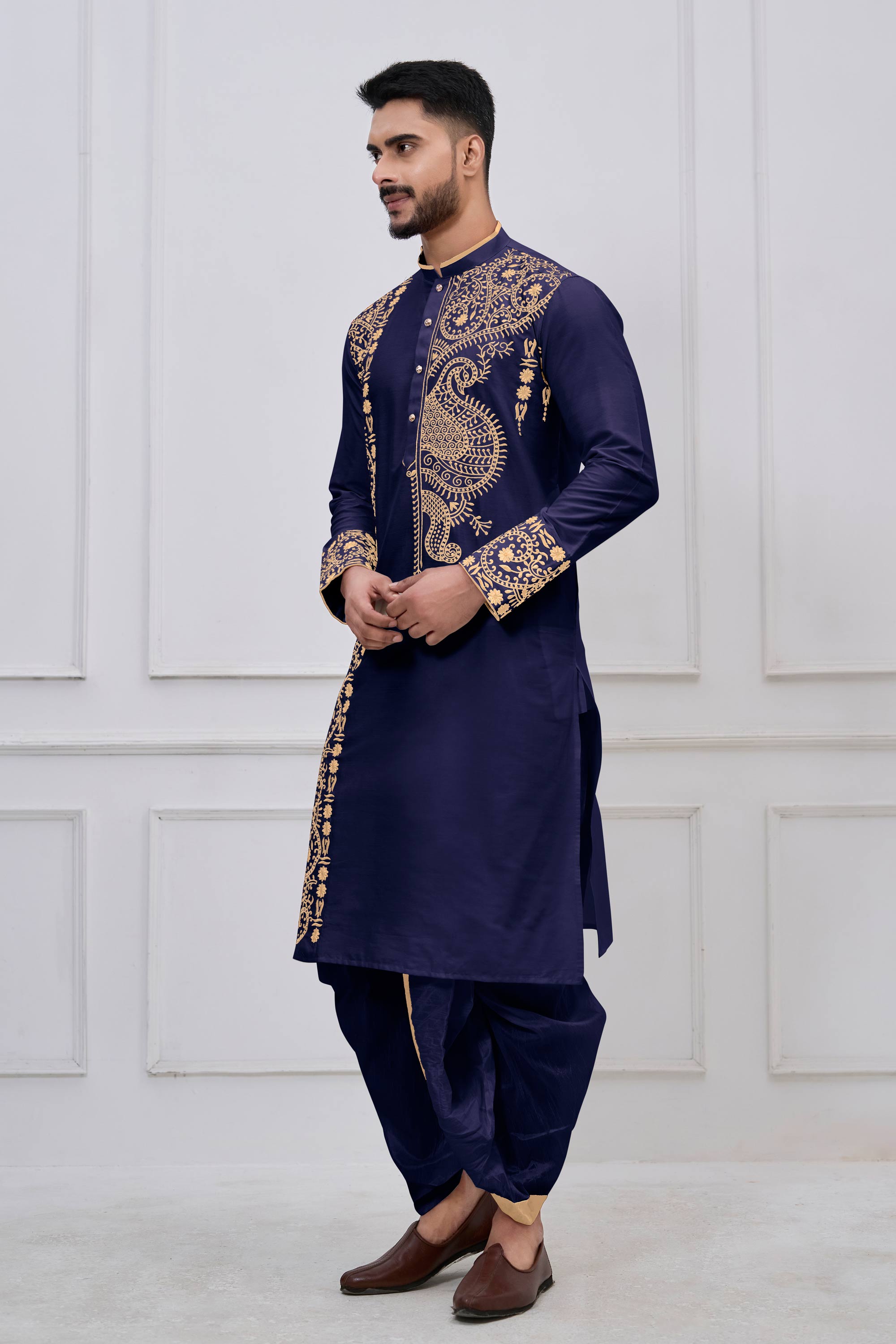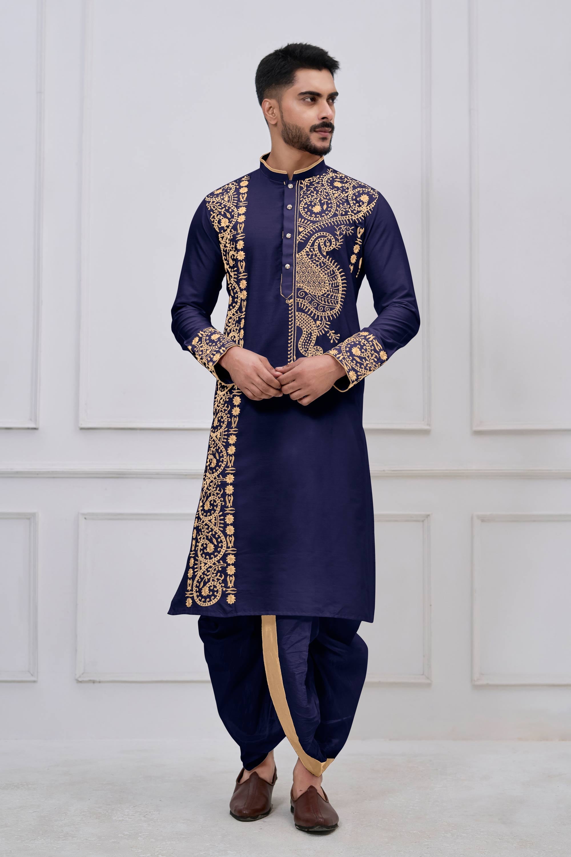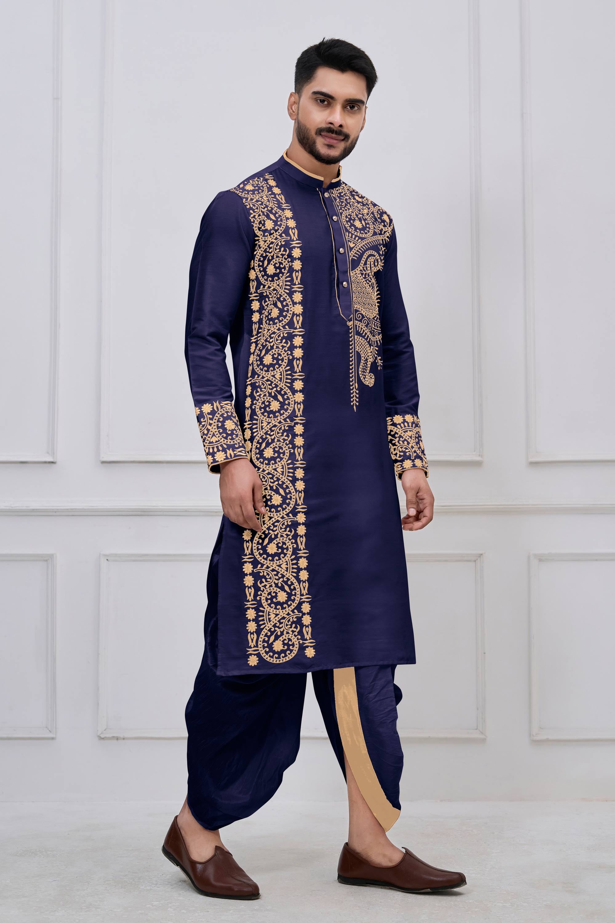 Embroidered Viscose Navy Blue Men Readymade Bengali Style Kurta With Dhoti For Festive Wear