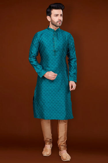 Jacquard Fabric Cyan Color Royal Kurta Pyjama For Men