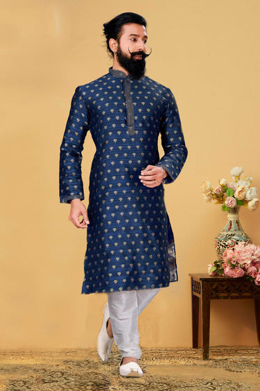 Jacquard Silk Blue Color Wedding Wear Readymade Designer Men Kurta Pyjama