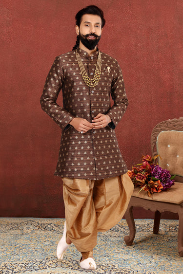 Jacquard Silk Fabric Brown Color Festive Wear Readymade Men Stylish Indo Western