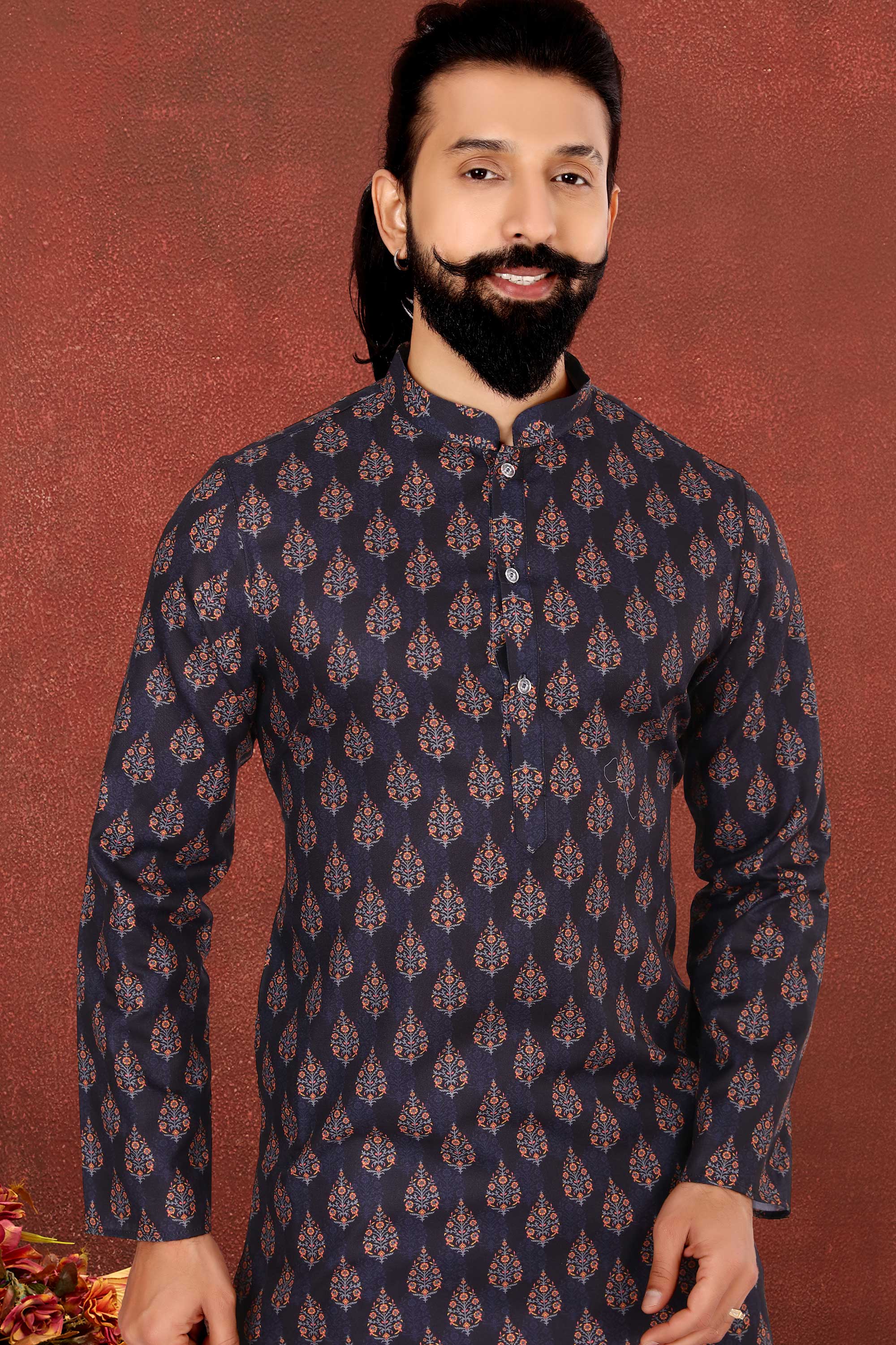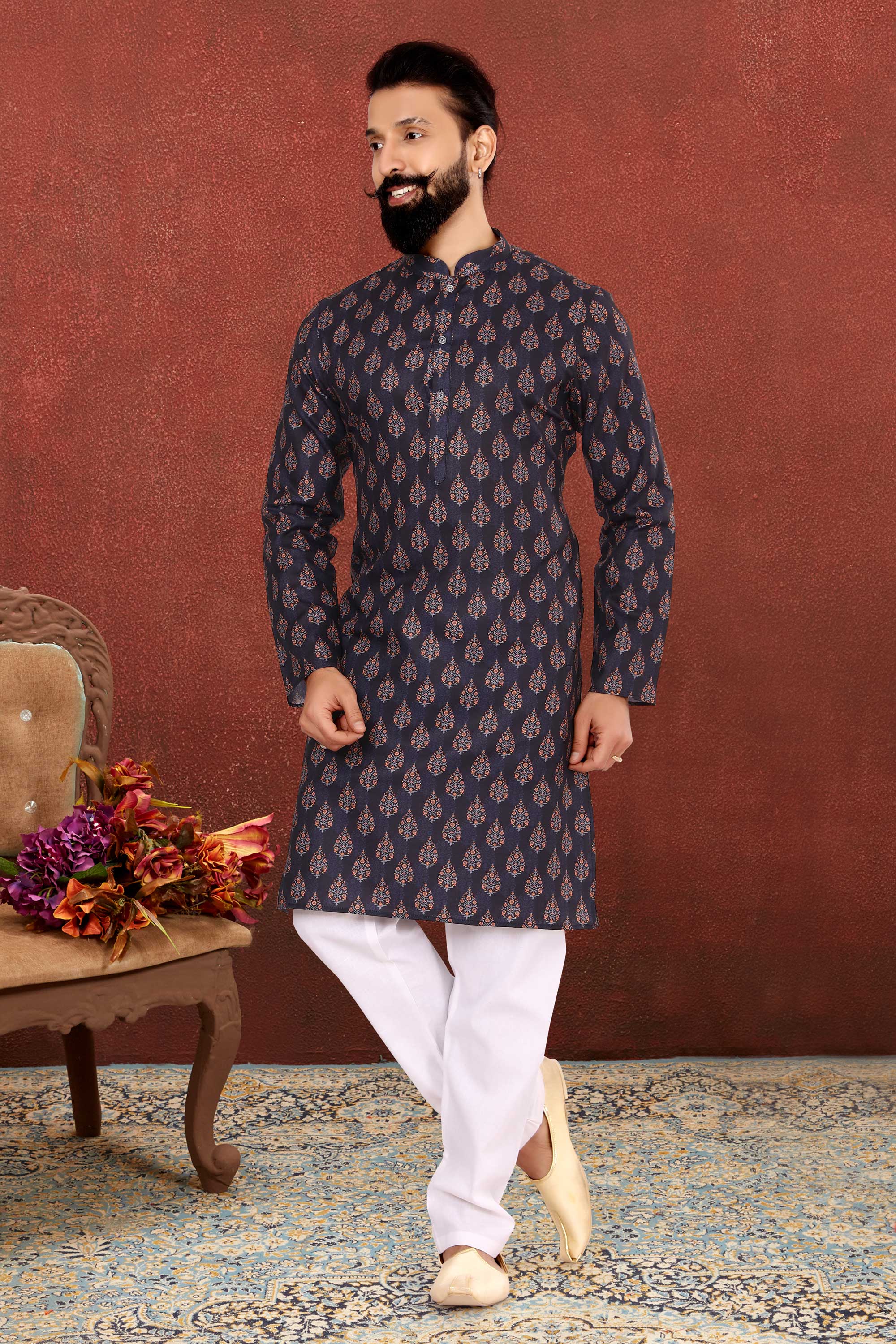 Navy Blue Color Cotton Fabric Reception Wear Striking Kurta Pyjama For Men