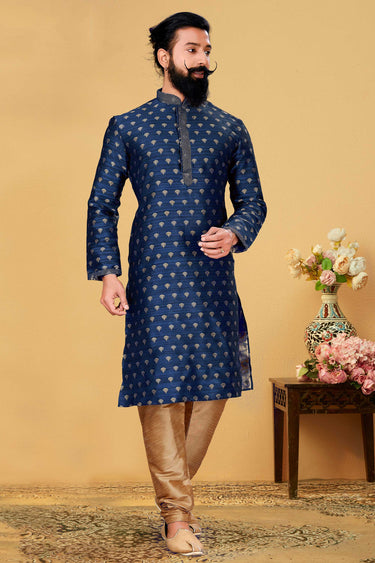 Navy Blue Jacquard Silk Fabric Sangeet Wear Trendy Readymade Kurta Pyjama For Men