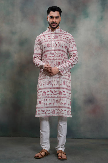 Printed Fancy Fabric Off White Men Readymade Kurta Pyjama For Festive Wear