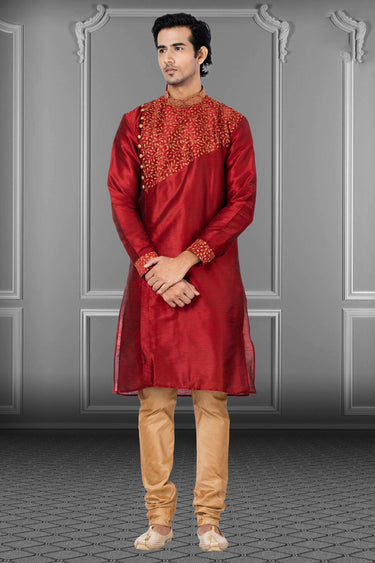 Sangeet Wear Readymade Kurta Pyjama For Men In Dhupion Fabric Maroon Color
