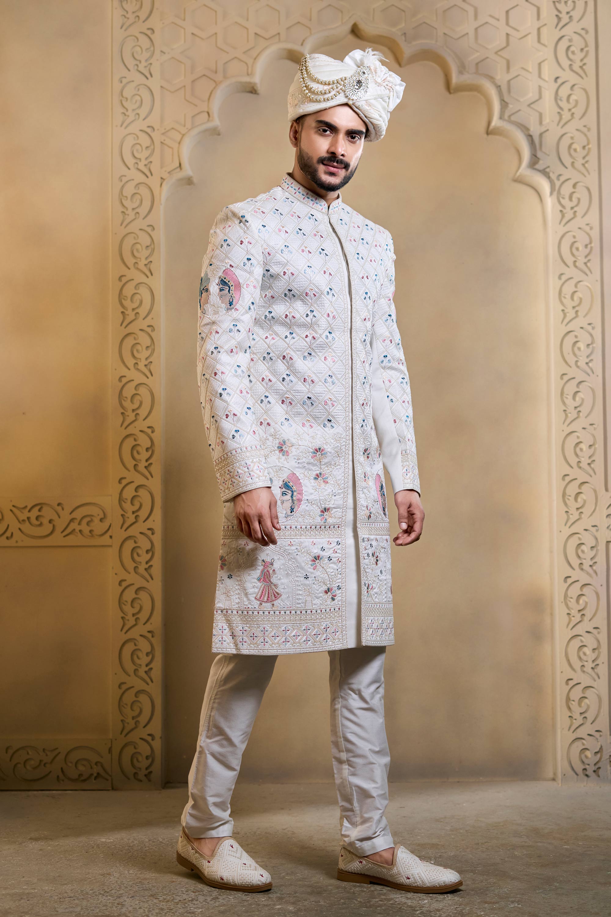 Silk Fabric White Men Readymade Groom Sherwani