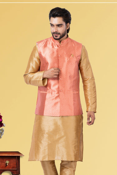 Peach Jacquard Silk Fabric Festive Wear Readymade Jacket For Men